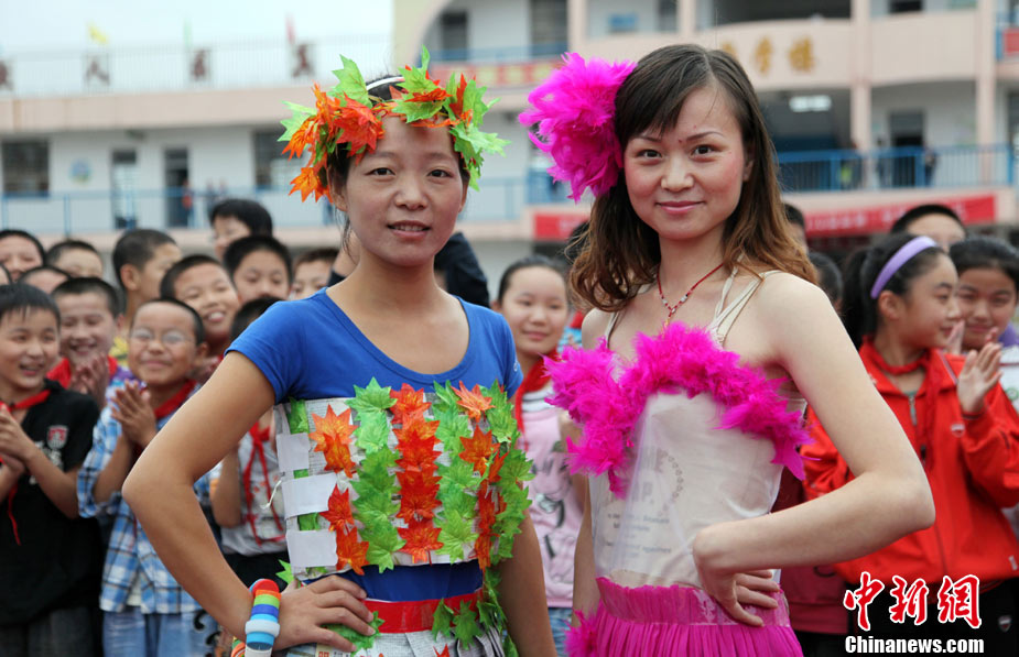 9月8日,山東省棗莊市市中區(qū)中興小學(xué)教師用舊報(bào)紙、光盤(pán)等廢舊物品制作的環(huán)!皶r(shí)裝”,向?qū)W生們進(jìn)行展示。他們用實(shí)際行動(dòng)引導(dǎo)學(xué)生養(yǎng)成低碳生活的良好習(xí)慣,喜迎教師節(jié)到來(lái)。中新社發(fā) 吉 喆 攝 圖片來(lái)源:CNSPHOTO