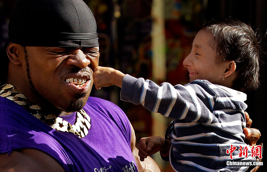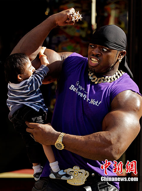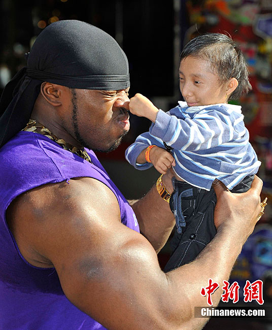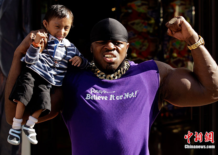 9月9日,全世界最矮男子——來自尼泊爾的馬嘉爾和英國胳膊最粗的男子安德魯.哈里森在倫敦參加“信不信由你”博物館的慶祝活動(dòng)。馬嘉爾17歲,是身高為56厘米;而28歲的哈里森的胳膊圍度達(dá)61厘米。但是塊頭大并不能給哈里森帶來多大便宜,相反小巧的馬嘉爾卻是靈活異常。