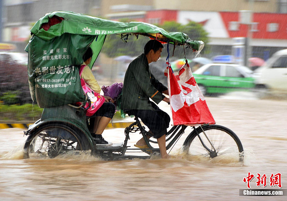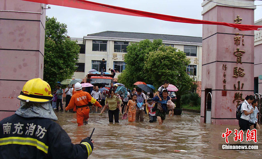 9月9日,四川省南充市突降暴雨,造成該市的高坪、嘉陵、順慶等主城區(qū)部分低洼地帶積水嚴(yán)重。高坪區(qū)第八小學(xué)、第六小學(xué),嘉陵區(qū)光彩實(shí)驗(yàn)小學(xué)被洪水圍困,南充消防官兵緊急出動(dòng),及時(shí)將被洪水圍困900多名小學(xué)生轉(zhuǎn)移至安全地帶。圖為消防、老師正在轉(zhuǎn)移受困學(xué)生。中新社發(fā) 南消萱 攝