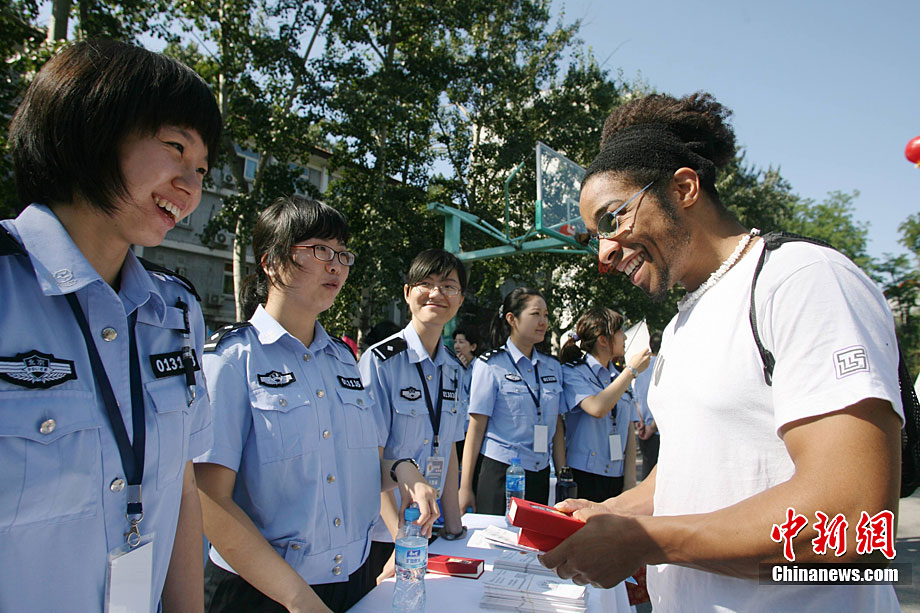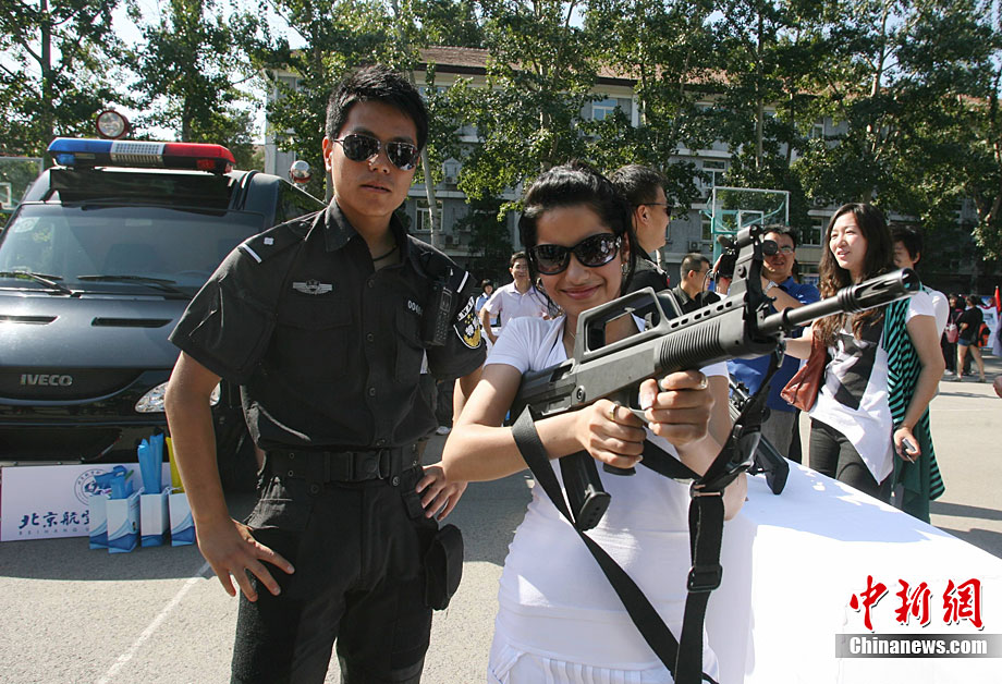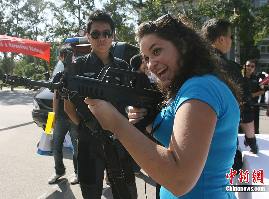 9月11日,北京語言大學(xué)一留學(xué)生在北京特警的講解下試用新型警用槍支。當日,北京市公安局在北京語言大學(xué)舉辦“平安北京進校園”主題活動。民警通過面對面的交流為外國留學(xué)生提供咨詢服務(wù),用英、德、西、日、韓5種語言,解答外國留學(xué)生在京居留、學(xué)習(xí)生活方面的各種問題,致力于提高外國留學(xué)生的安全感和滿意度。中新社發(fā) 蘇丹 攝