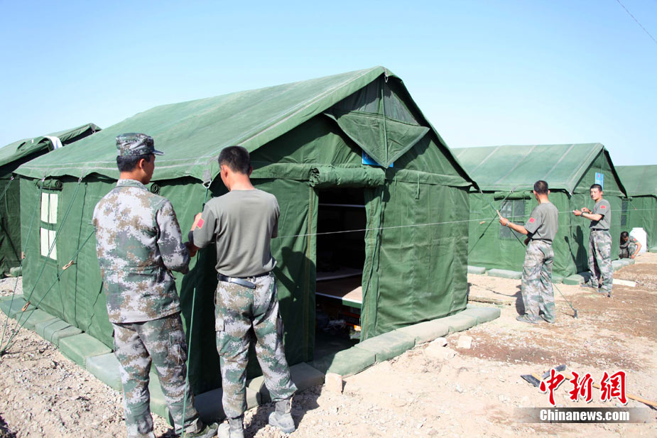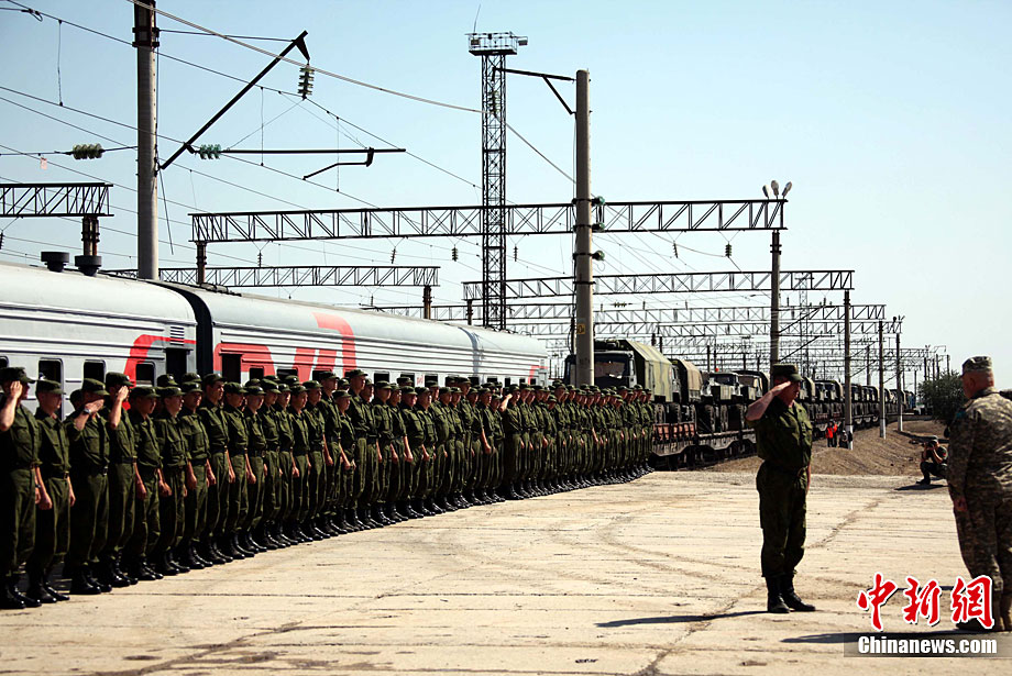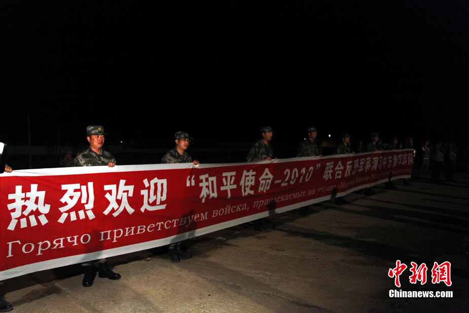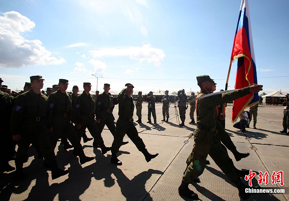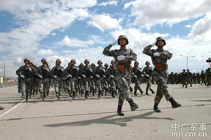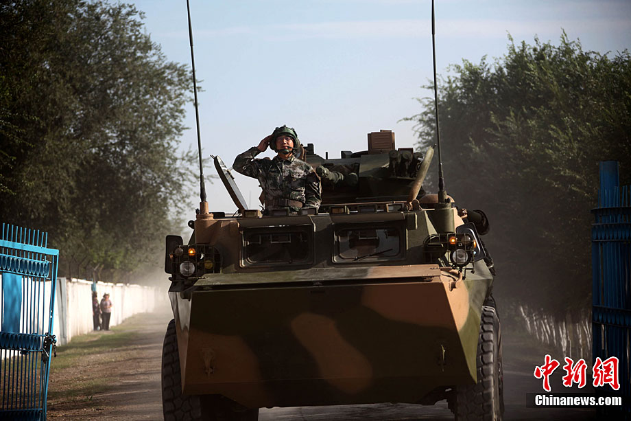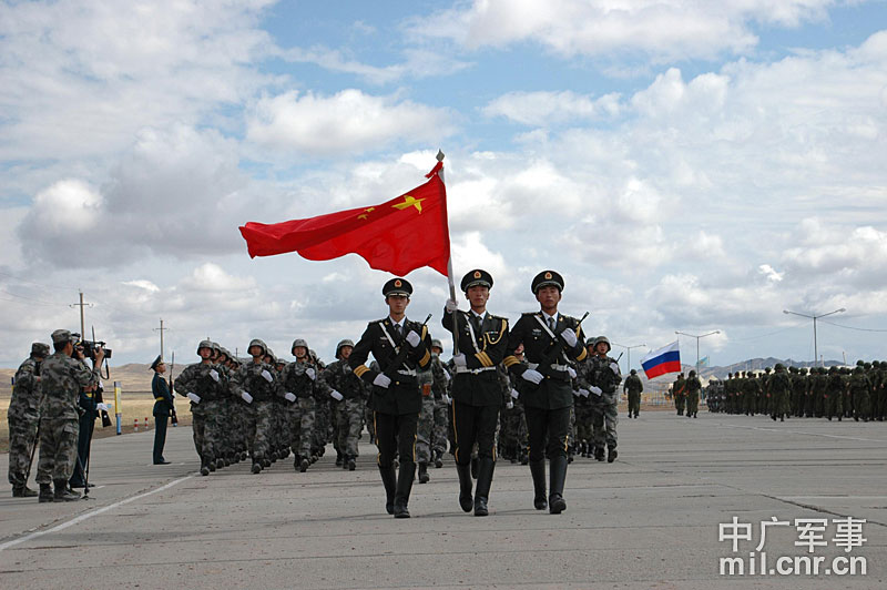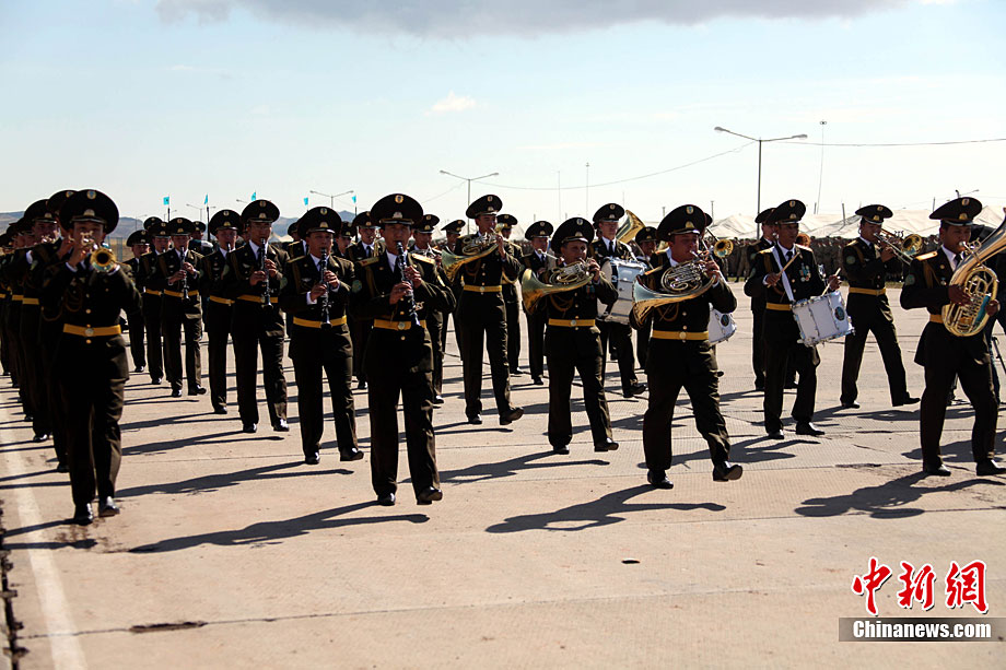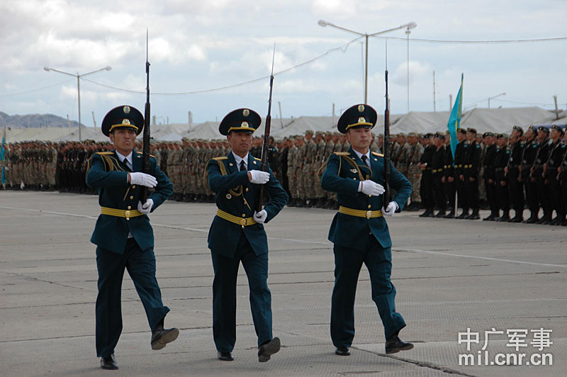 9月13日,“和平使命-2010”上海合作組織聯(lián)合反恐軍事演習(xí)在哈薩克斯坦馬特布拉克訓(xùn)練場舉行盛大的開訓(xùn)儀式,標(biāo)志著這次聯(lián)合軍演由戰(zhàn)役磋商階段正式轉(zhuǎn)入戰(zhàn)役準(zhǔn)備階段。隨后,哈、中、吉、俄、塔五方參演部隊(duì)依次舉行分列式,圖為中方參演部隊(duì)邁著矯健的步伐從開訓(xùn)儀式主席臺前列隊(duì)走過,接受檢閱。中新社記者 孫自法 攝