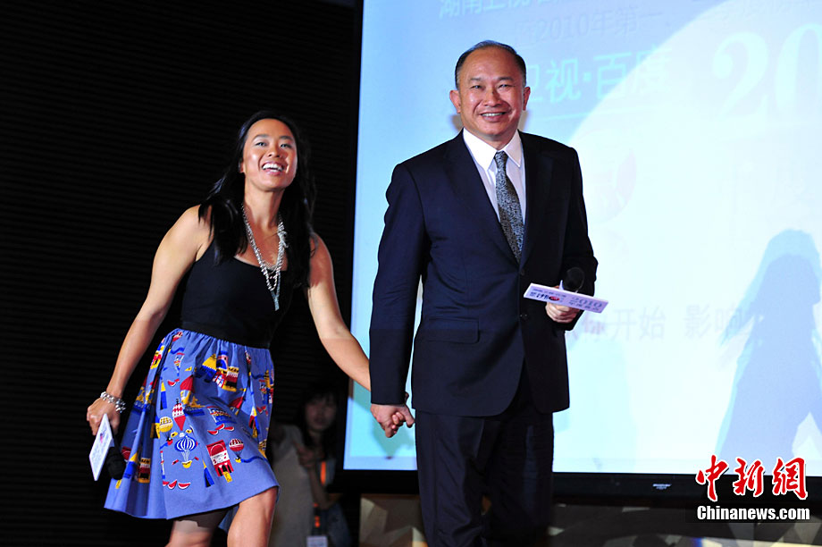 9月13日,“湖南衛(wèi)視·百度娛樂(lè)沸點(diǎn)2010年度盤(pán)點(diǎn)”啟動(dòng)儀式暨第一、第二季度榜單公布儀式于北京舉行。剛剛獲得威尼期電影節(jié)“終身成就獎(jiǎng)”的吳宇森導(dǎo)演攜女兒吳飛霞首次一起公開(kāi)亮相內(nèi)地。吳飛霞在吳宇森執(zhí)導(dǎo),云集楊紫瓊、大S等眾多國(guó)際明星的最新武俠大片《劍雨》中出演了重要角色,她也成為現(xiàn)場(chǎng)媒體關(guān)注的焦點(diǎn)人物,然而從小在美國(guó)長(zhǎng)大的吳飛霞國(guó)語(yǔ)水平看來(lái)有限,無(wú)奈只好講英文請(qǐng)老爸救急當(dāng)翻譯,兩人現(xiàn)場(chǎng)大秀父女情深。中新社記者 李學(xué)仕 攝