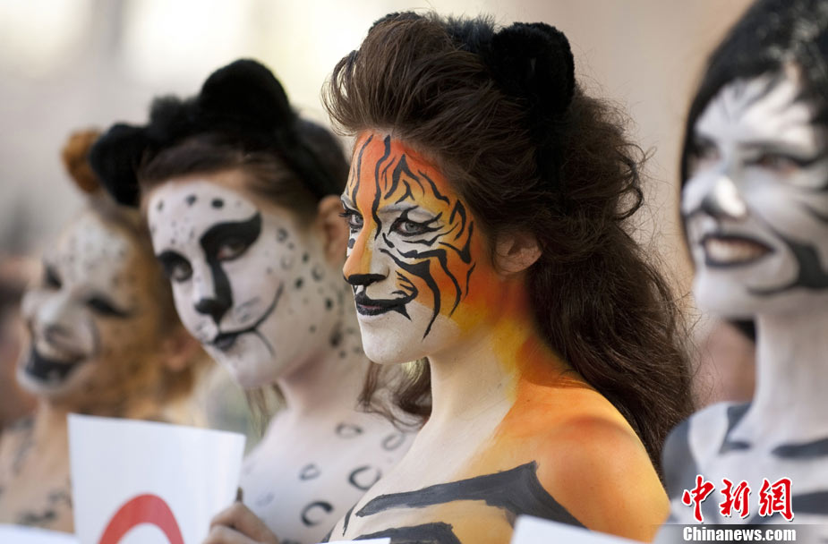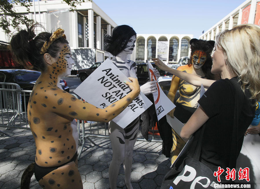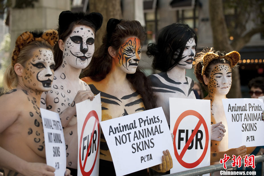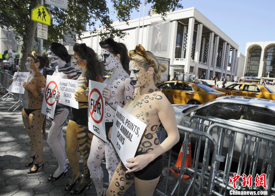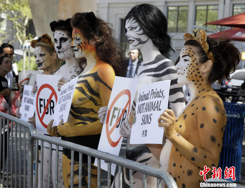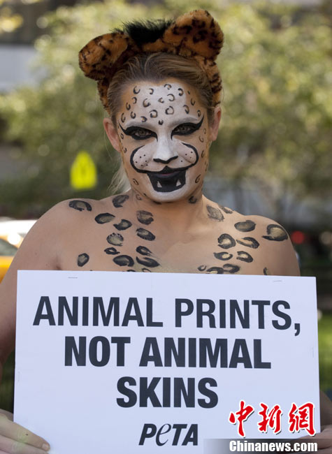 9月14日,在紐約時(shí)裝周進(jìn)行期間,幾位環(huán)保愛(ài)好者在身上涂畫(huà)“動(dòng)物彩繪”,呼吁保護(hù)動(dòng)物,愛(ài)護(hù)環(huán)境。