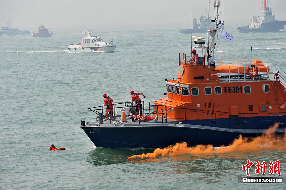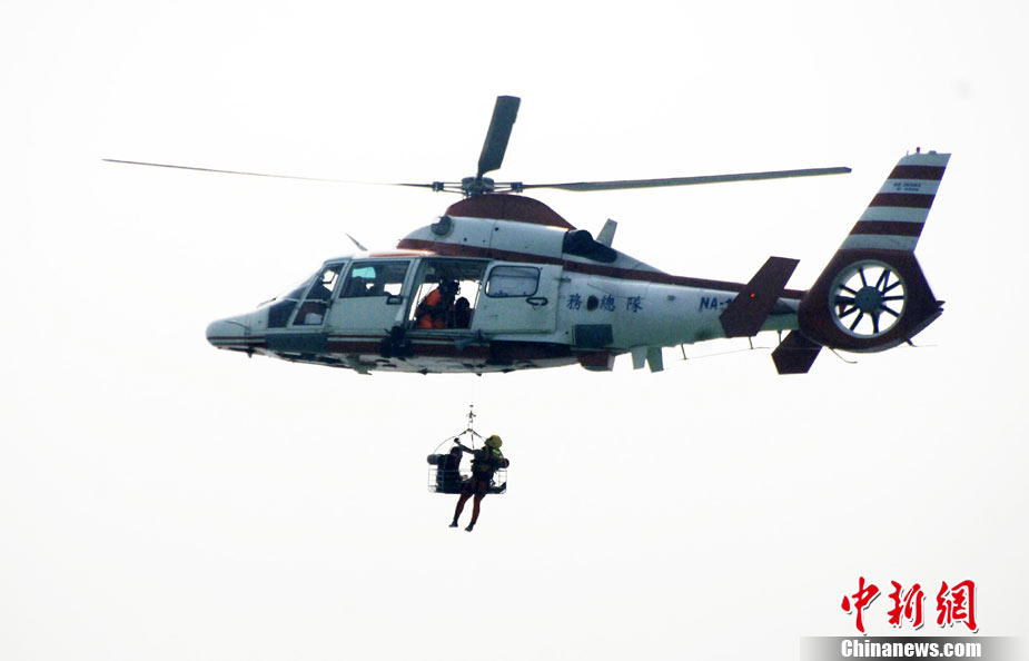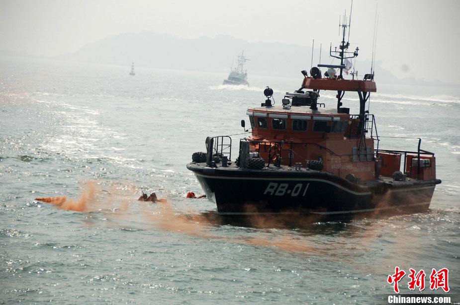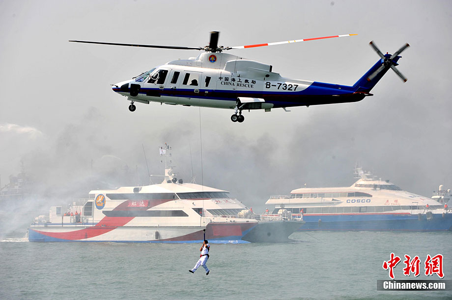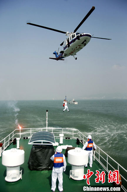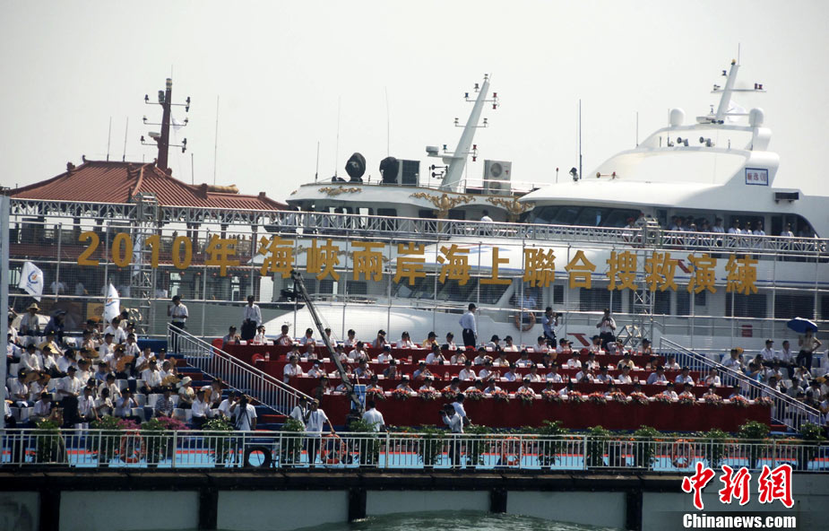 9月16日上午,2010年海峽兩岸海上聯(lián)合搜救演練在臺(tái)灣海峽的廈門(mén)、金門(mén)附近海域舉行。海峽兩岸海上搜救單位參演人數(shù)400多人,共動(dòng)用搜救船舶14艘、救助飛機(jī)3架。其中大陸方面主要參演船舶9艘、救助直升機(jī)2架;臺(tái)灣方面主要參演船舶5艘、救助直升機(jī)1架。這是自2008年12月15日兩岸海上直航正式啟動(dòng)以來(lái),海峽兩岸海上搜救力量首次共同進(jìn)行的大規(guī)模海陸空聯(lián)合搜救演練。圖為演練現(xiàn)場(chǎng)。中新社發(fā) 王東明 攝
