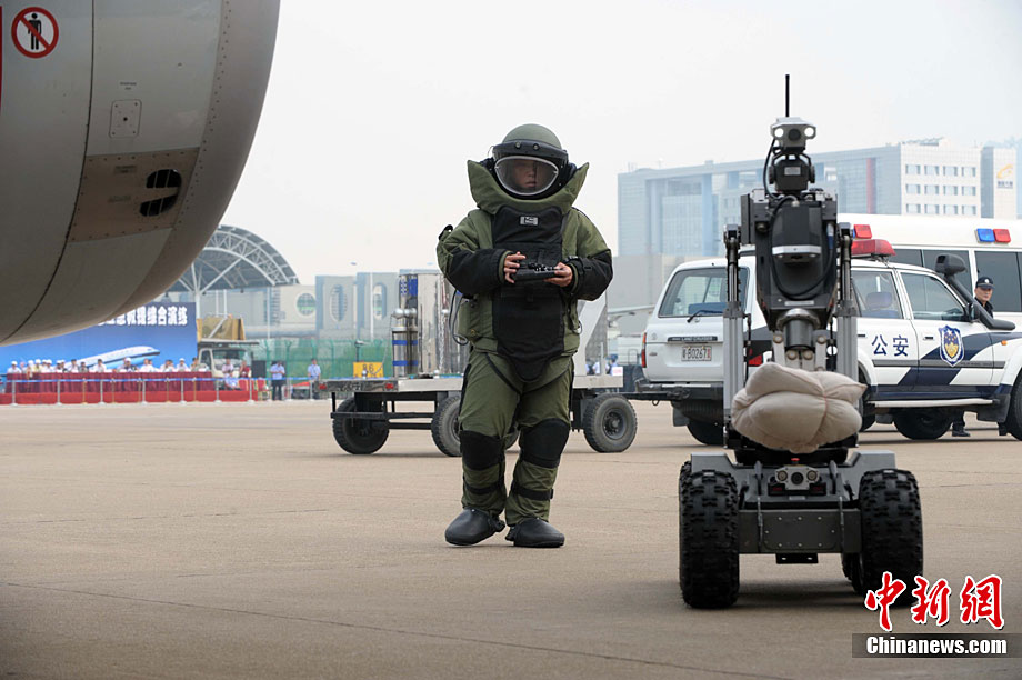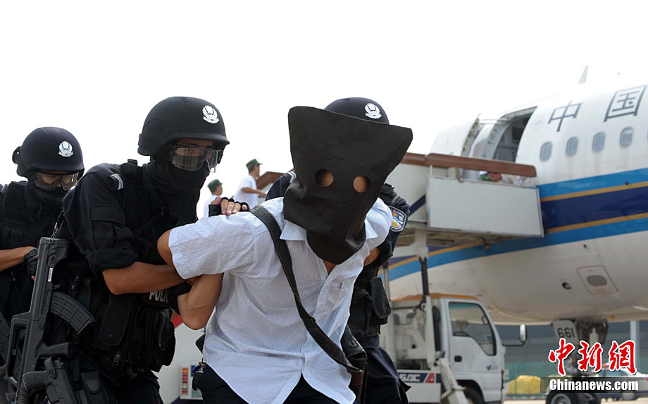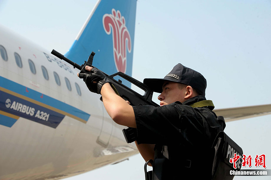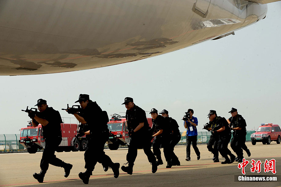 9月16日,深圳寶安國際機場舉行反恐應(yīng)急演習(xí),模擬一架客機被歹徒劫持后,特警、防爆、消防、醫(yī)療救護等各方面展開營救,在短時間內(nèi)解救人質(zhì)處理事故。中新社記者 陳文 攝