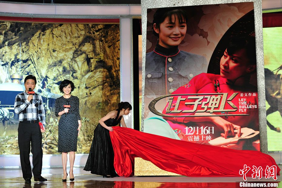 9月16日,將于12月26日震撼上映的電影《讓子彈飛》導(dǎo)演姜文攜主演劉嘉玲、廖凡、邵兵亮相北京,為即將上映的新作站臺(tái)宣傳。當(dāng)回答“票房預(yù)期”時(shí),姜文自信的表示“我們這個(gè)戲里有葛優(yōu),有周潤(rùn)發(fā),以前別人說一個(gè)電影‘不優(yōu)不發(fā)’或者說‘不發(fā)不優(yōu)’。那我們這個(gè)片子里又有(葛)優(yōu)又有(周潤(rùn))發(fā),我都不敢想能賣多少了! 女主角劉嘉玲在片中“情挑”姜文、周潤(rùn)發(fā)、葛優(yōu)三影帝。她更是對(duì)《讓子彈飛》成為今年內(nèi)地票房冠軍充滿信心,表示假如梁朝偉《一代宗師》趕上賀歲檔,樂意打敗他們。