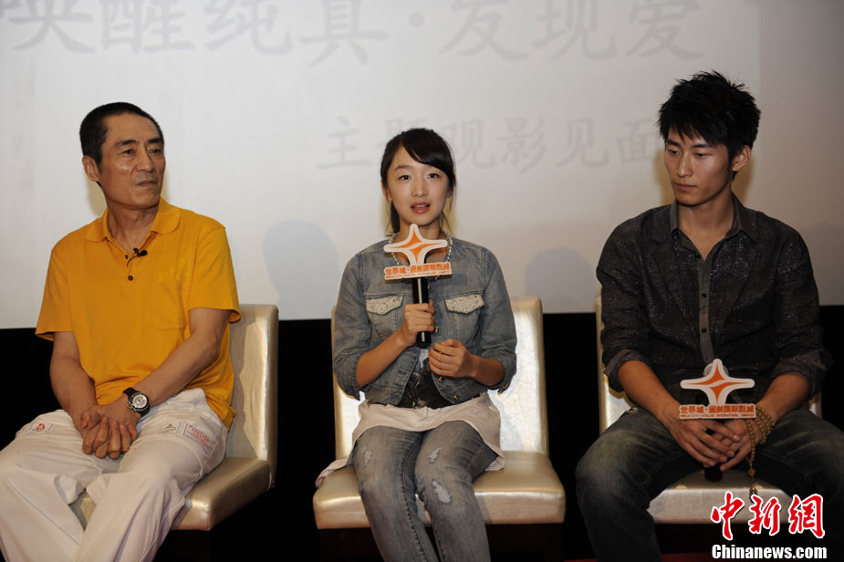 9月16日晚,由國際在線網(wǎng)站,中國國際廣播電臺(tái)輕松調(diào)頻91.5以及北京新畫面影業(yè)公司共同打造的“喚醒純真·發(fā)現(xiàn)愛”《山楂樹之戀》北京觀影見面會(huì)活動(dòng)在世界城星美國際影城舉行!渡介珮渲畱佟穼(dǎo)演張藝謀攜影片兩位主演周冬雨和竇驍一同出席了活動(dòng),為觀眾講述了電影《山楂樹之戀》戲里戲外的故事。 中新網(wǎng)記者 王紅綱攝