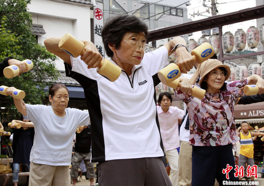 9月20日是日本的“敬老日”,眾多民眾在這一天來(lái)到東京的一家寺院,集體做啞鈴操迎接“敬老日”。