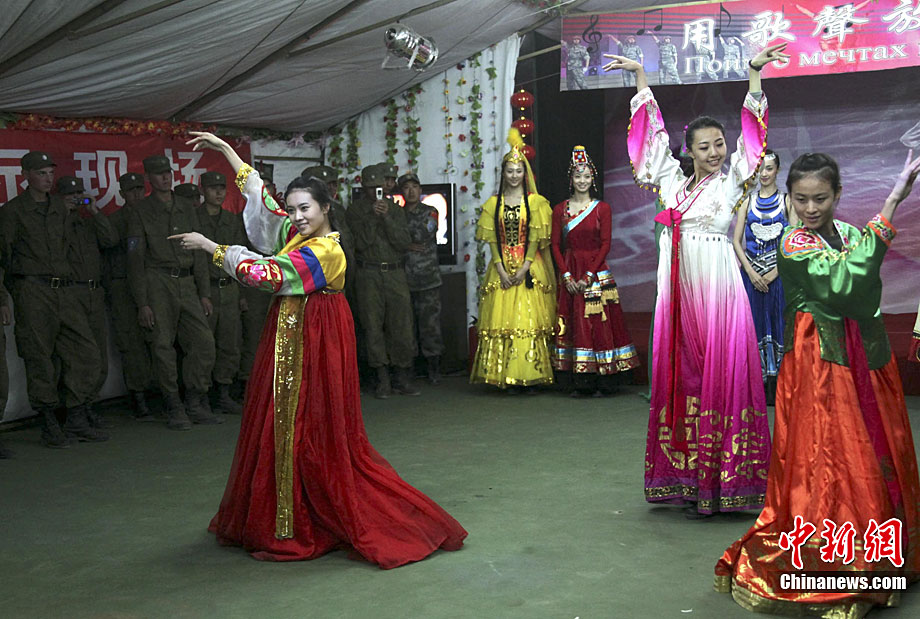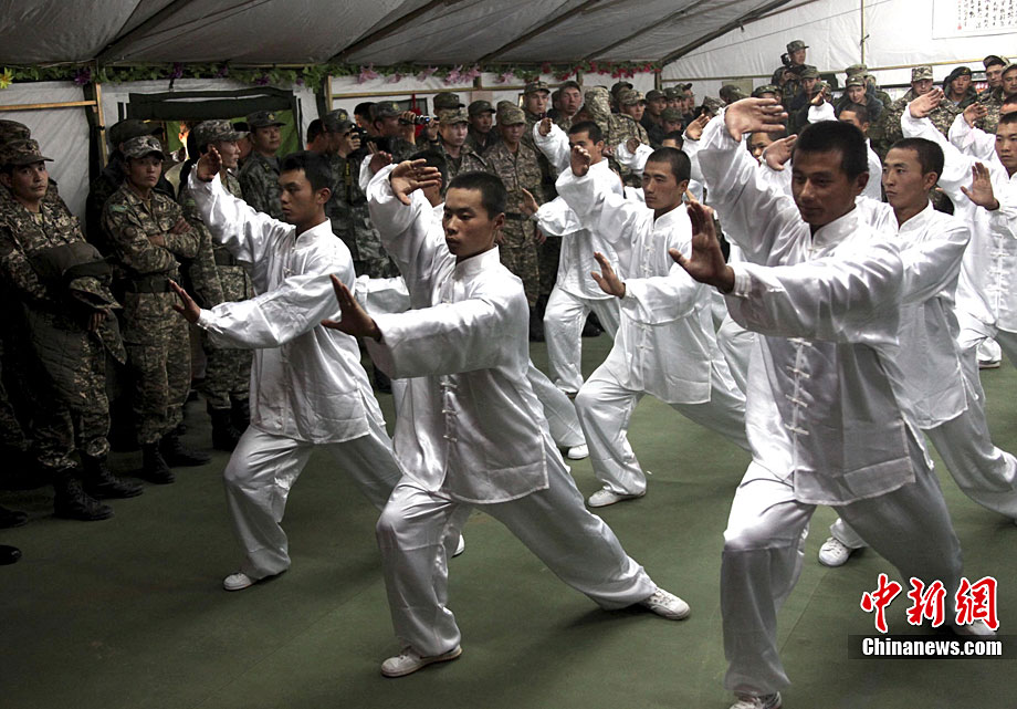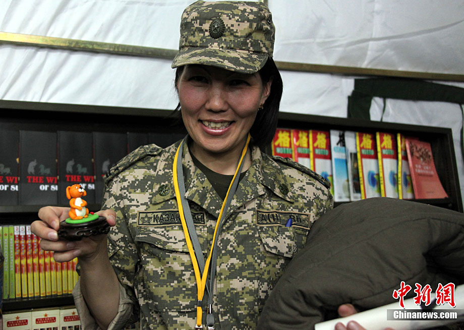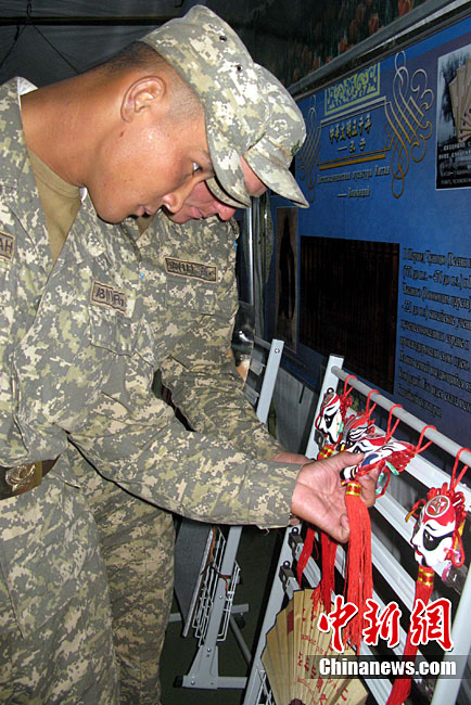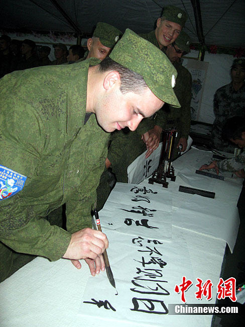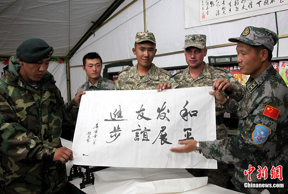 9月20日是“和平使命-2010”聯(lián)演確定的中國民族文化日,當?shù)貢r間黃昏時分至晚上,哈薩克斯坦、俄羅斯、塔吉克斯坦、吉爾吉斯斯坦參演部隊官兵應(yīng)邀先后來到中方野戰(zhàn)兵營內(nèi)的“民族文化屋”帳蓬,觀賞、體驗博大精深的中國文化。圖為中方參演官兵現(xiàn)場揮毫并將書法作品贈送給哈方官兵。中新社記者 孫自法 攝