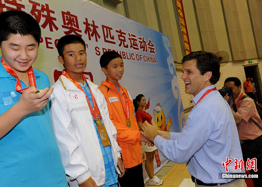 9月24日,在本屆特奧運(yùn)動(dòng)會(huì)男子籃球C組決賽中,福建一團(tuán)力克對(duì)手獲得冠軍。圖為比賽結(jié)束后福建一團(tuán)特奧籃球運(yùn)動(dòng)員張華閩、張華粵雙胞胎兄弟與一旁觀賽的母親唐秀玲相擁而泣,場(chǎng)面感人。劉可耕 攝