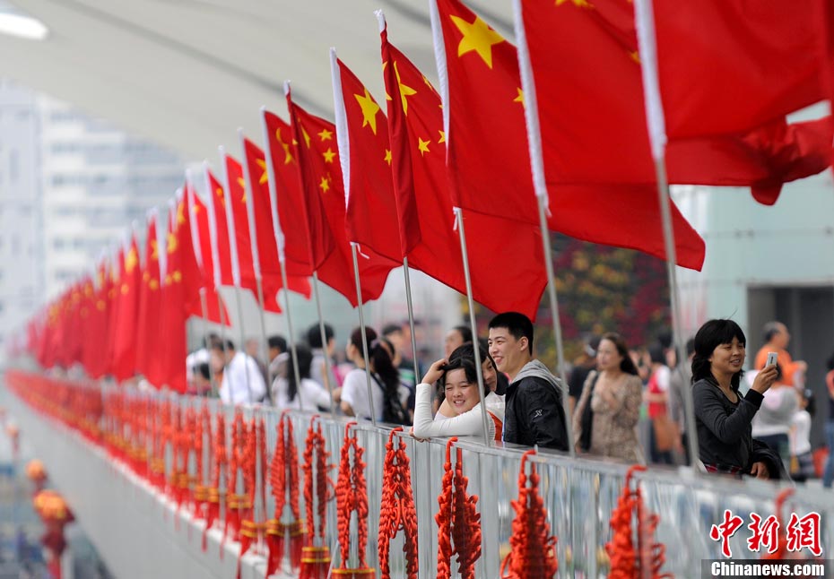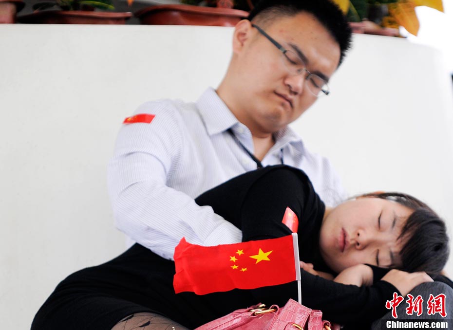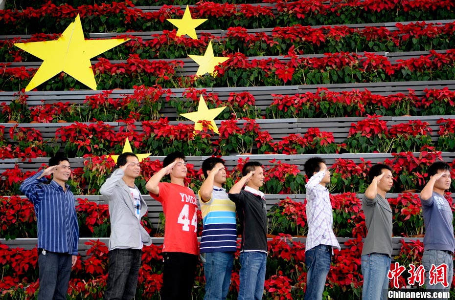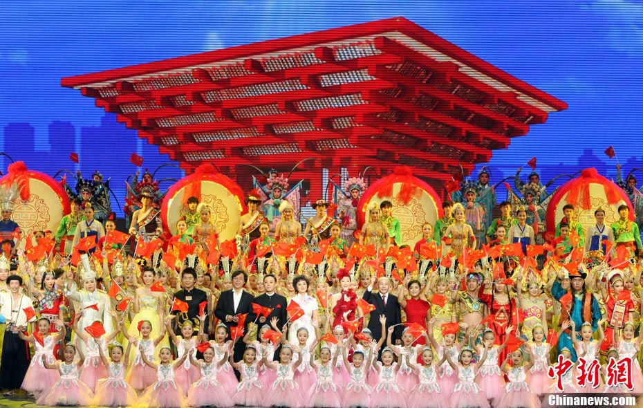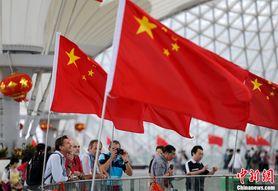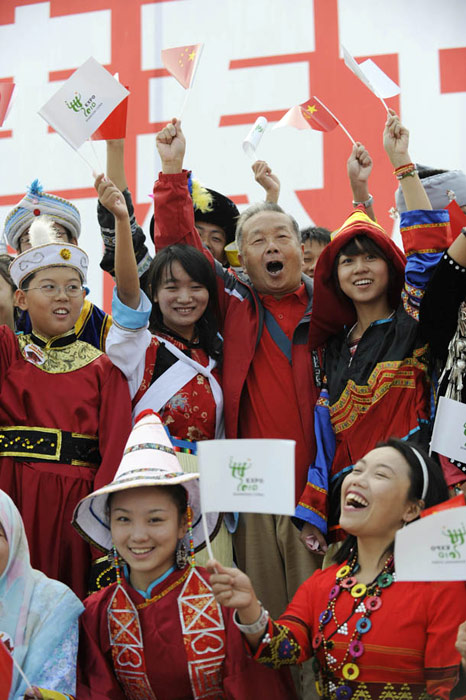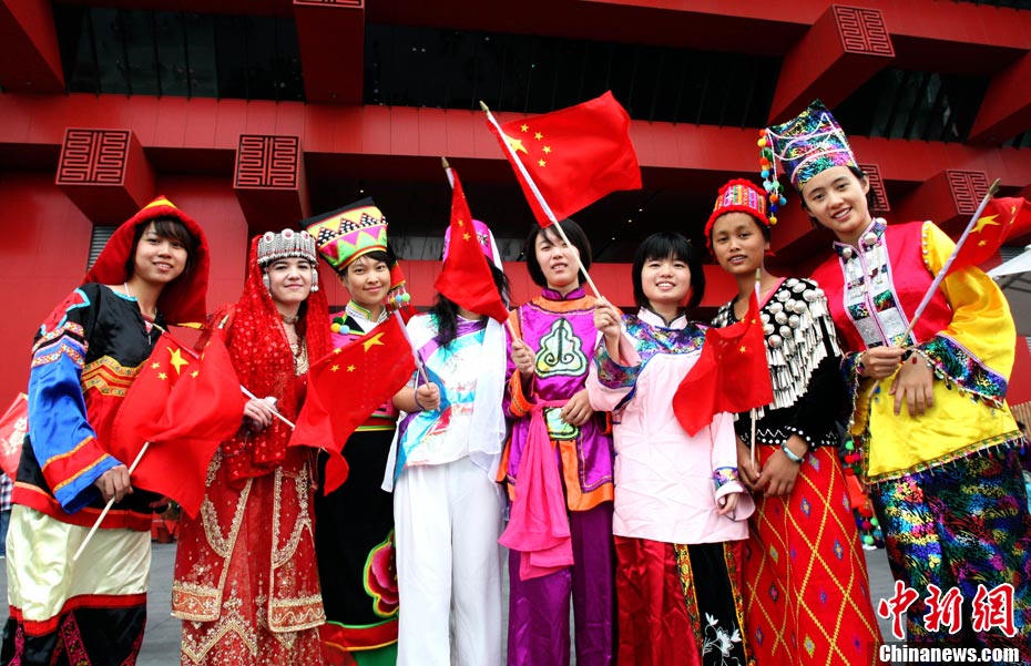 10月1日,在世博園浦西船塢廣場(chǎng),56個(gè)民族代表準(zhǔn)備參加升國旗儀式。新華社記者 郭磊 攝