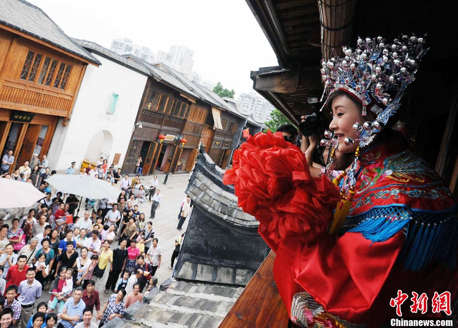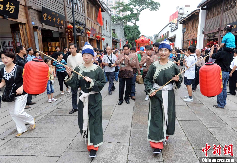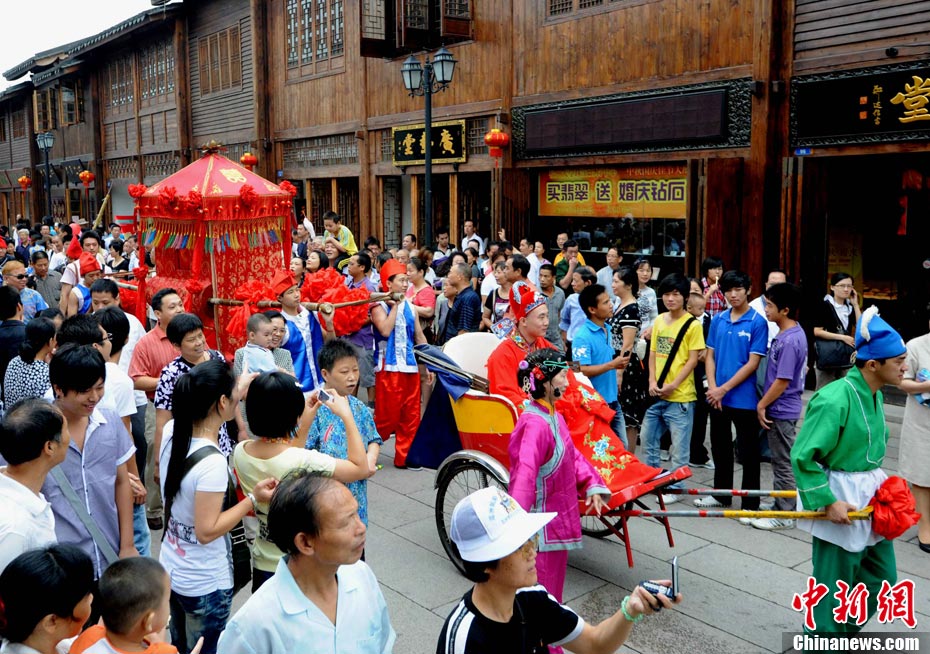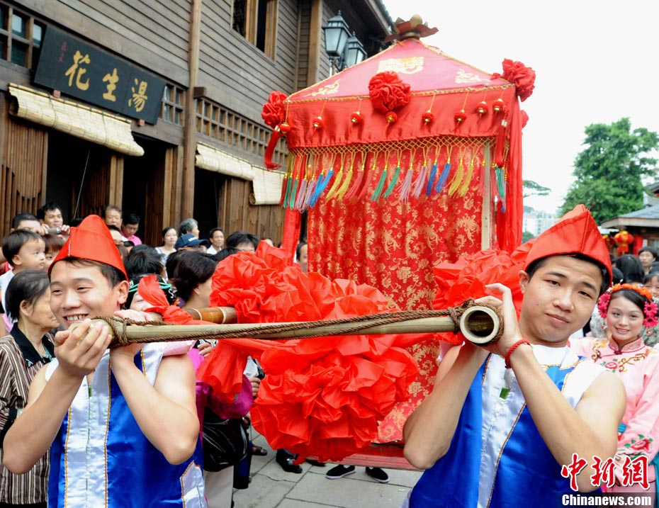 10月1日國慶節(jié),福州古街上演一場傳統民俗婚禮令眾多游客爭睹。該傳統民俗婚禮分起轎、回車馬、迎轎、下轎、祭拜天地、入洞房等場面喜慶。