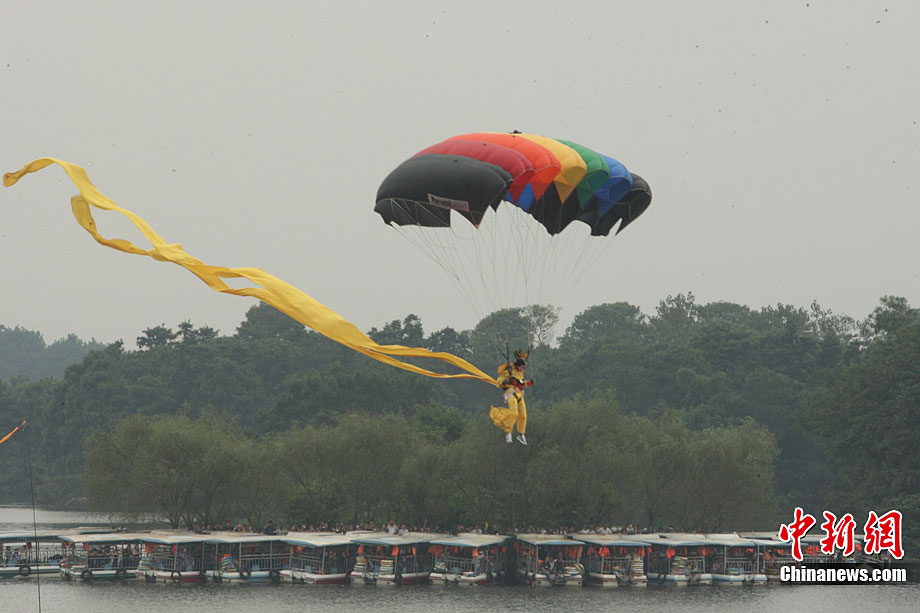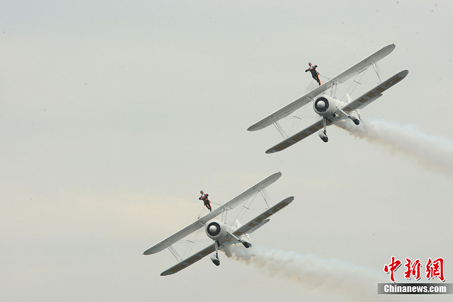 中新網(wǎng)大足10月4日電 (連肖 杜遠)4日下午,重慶大足首屆國際航空體育旅游節(jié)開幕,空軍“八一”跳傘隊和英國兩支特技飛行隊在大足龍水湖上空上演了多項空中特技。其中,兩名英國女郎站在時速高達240公里的飛機機翼上表演各種芭蕾動作,引得觀眾大呼驚險。連肖 攝