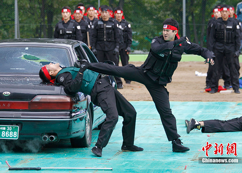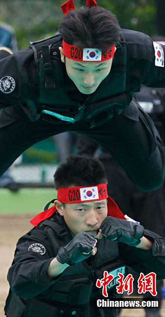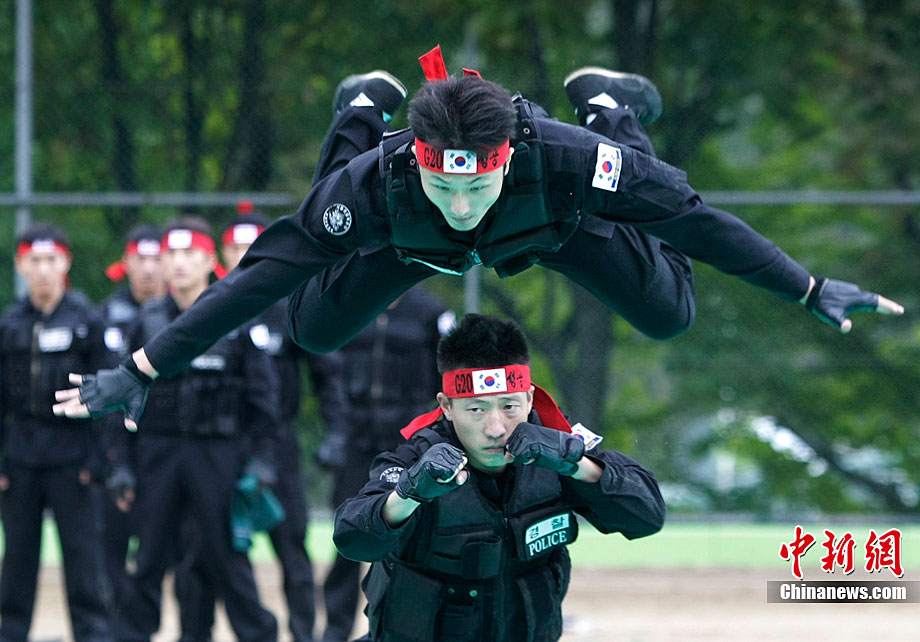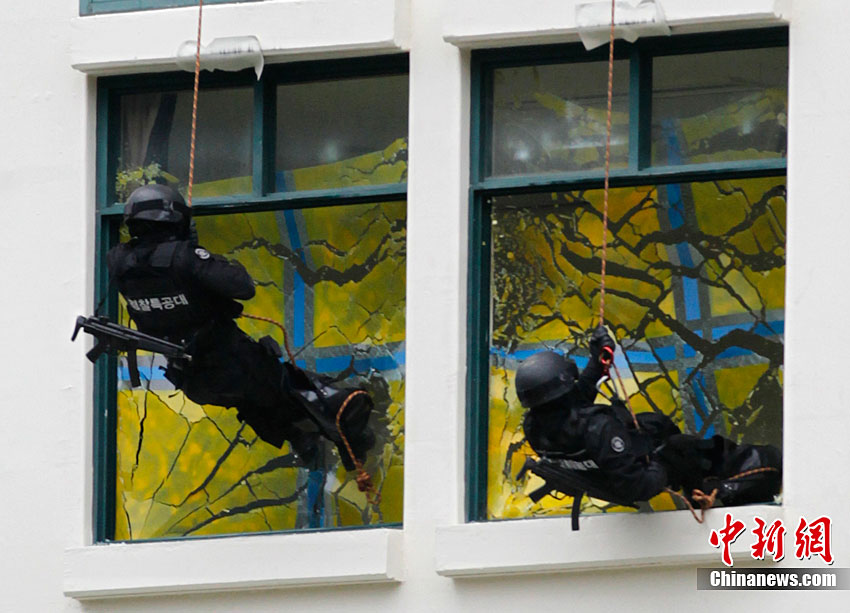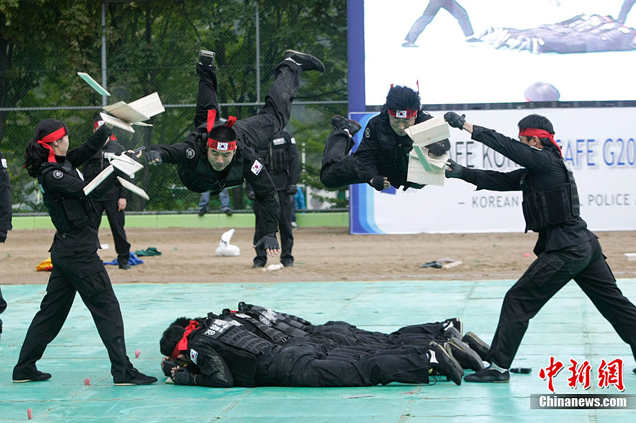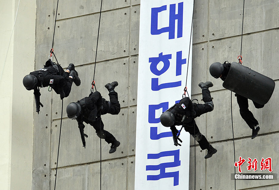 當?shù)貢r間10月4日,韓國特警在首爾舉行了反恐演習(xí)。此次演習(xí)是為了即將于11月在韓國舉行的G20首腦峰會而做的準備工作。