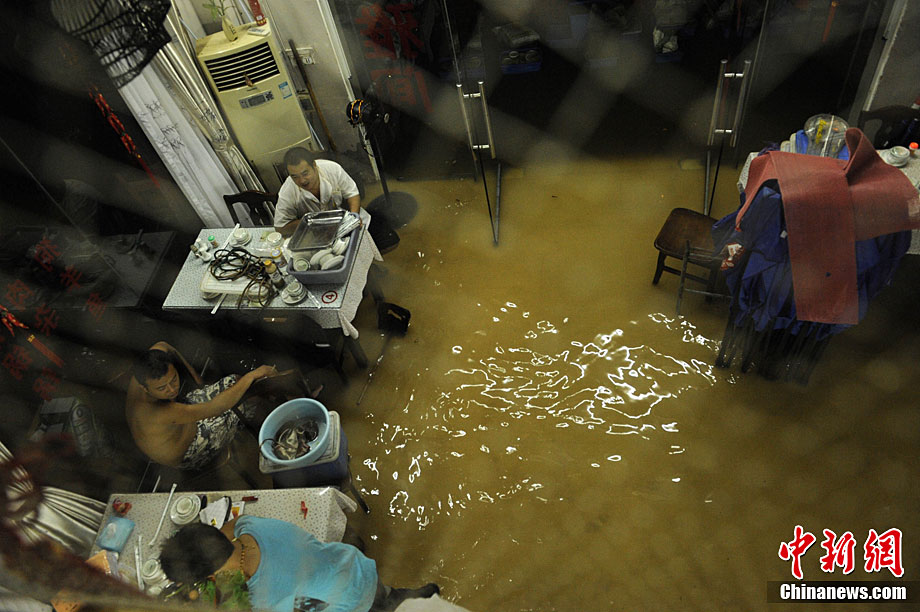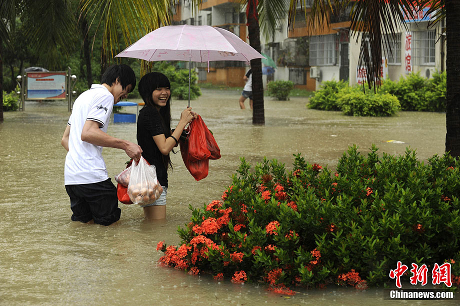 10月5日,持續(xù)五天的暴雨導致三亞多個小區(qū)嚴重積水。不少市民家中進水,商戶紛紛歇業(yè)避雨。徐勤濤 攝 圖片來源:cnsphoto