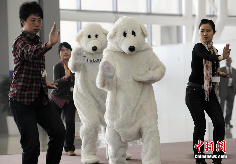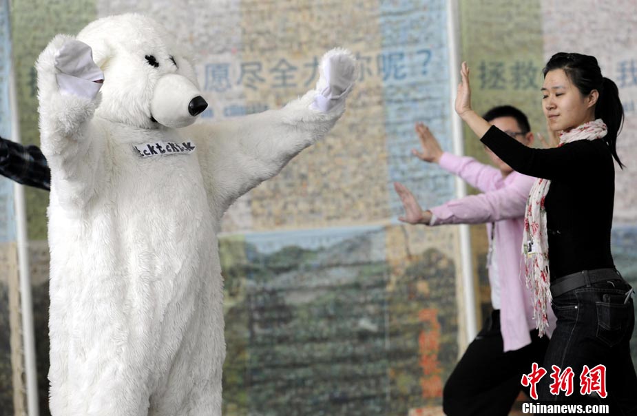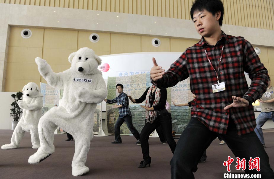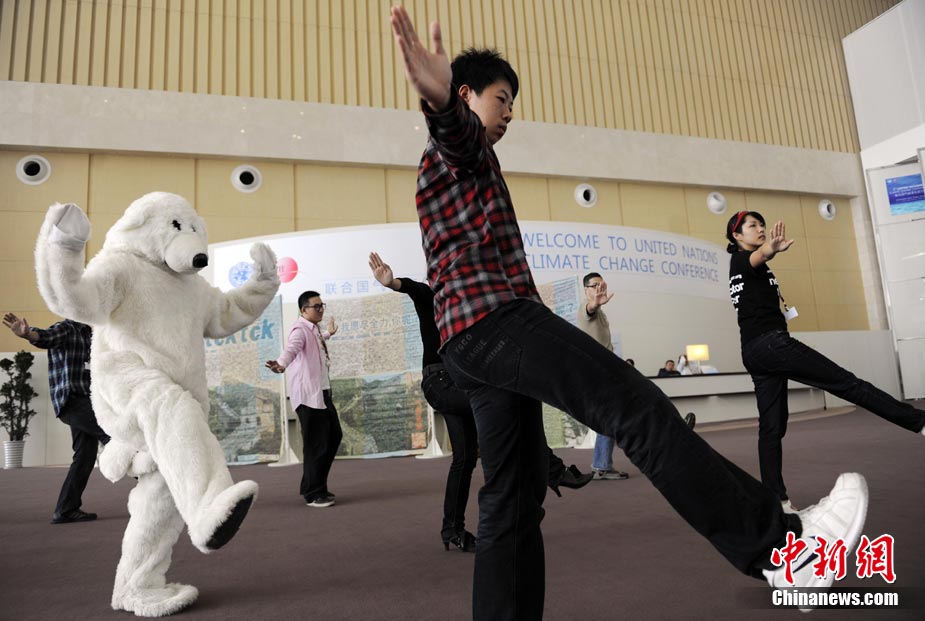 10月6日,聯(lián)合國氣候變化國際談判天津會議繼續(xù)舉行。全球氣候行動聯(lián)盟(TckTckTck 運動)特意安排了一個“北極熊”打太極的活動,邀請各國代表進入會場之前加入打太極拳。希望這兩天談判各方達成一個 “balanced package"(顧及各方利益的均衡協(xié)議),并以此警示人們愛護環(huán)境,拯救地球氣候。該組織由200個來自中國以及世界其他國家民間組織組成。 中新社記者 劉震 攝