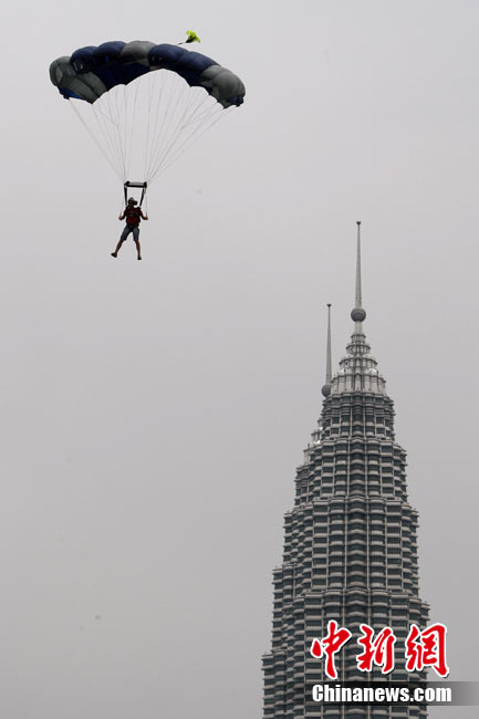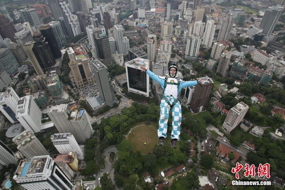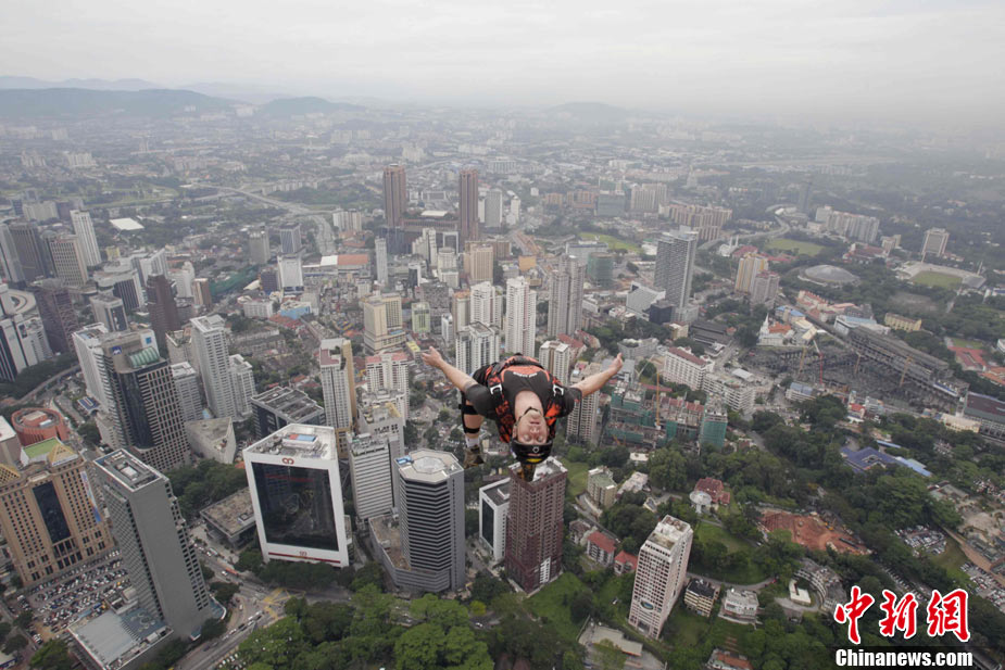 10月7日,幾位極限高手在馬來西亞吉隆坡的雙子高塔上大玩跳躍,體驗超乎尋常的刺激感受。