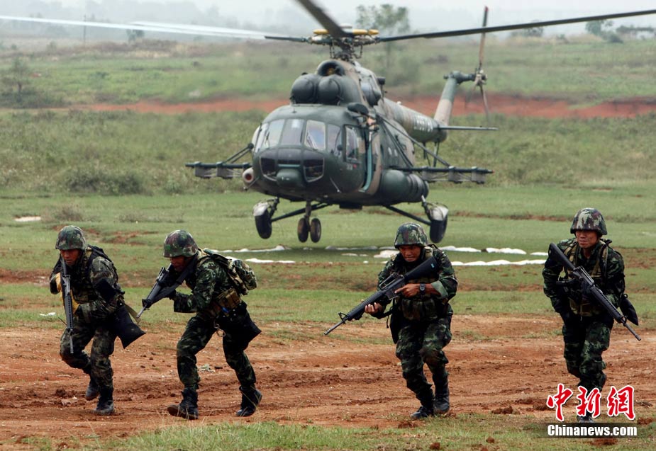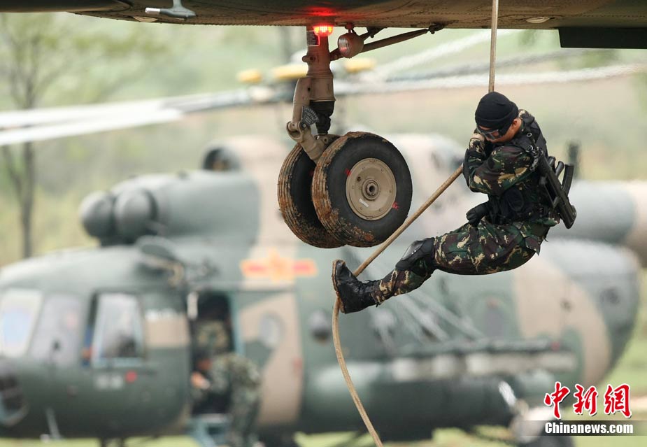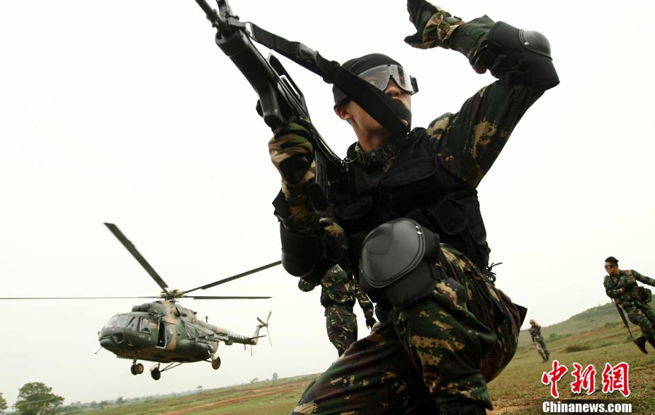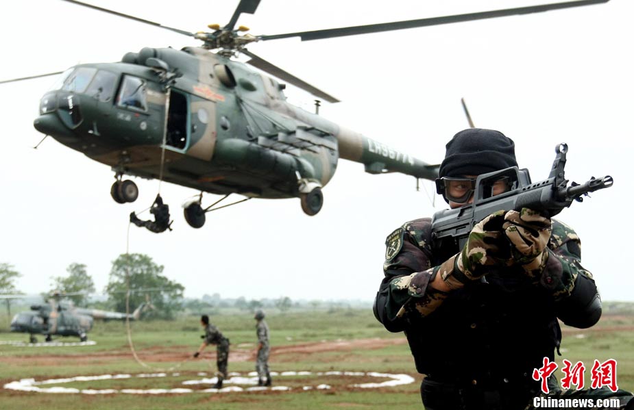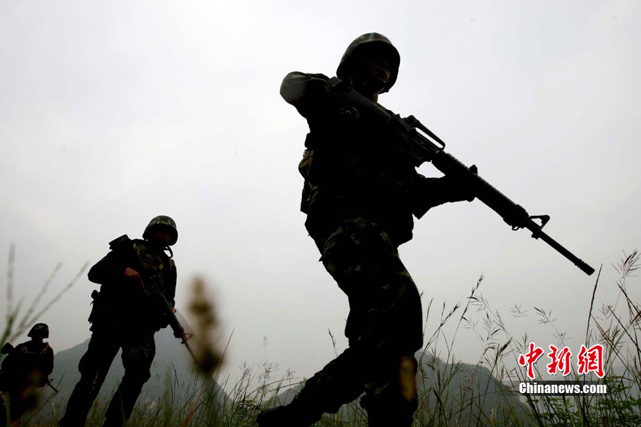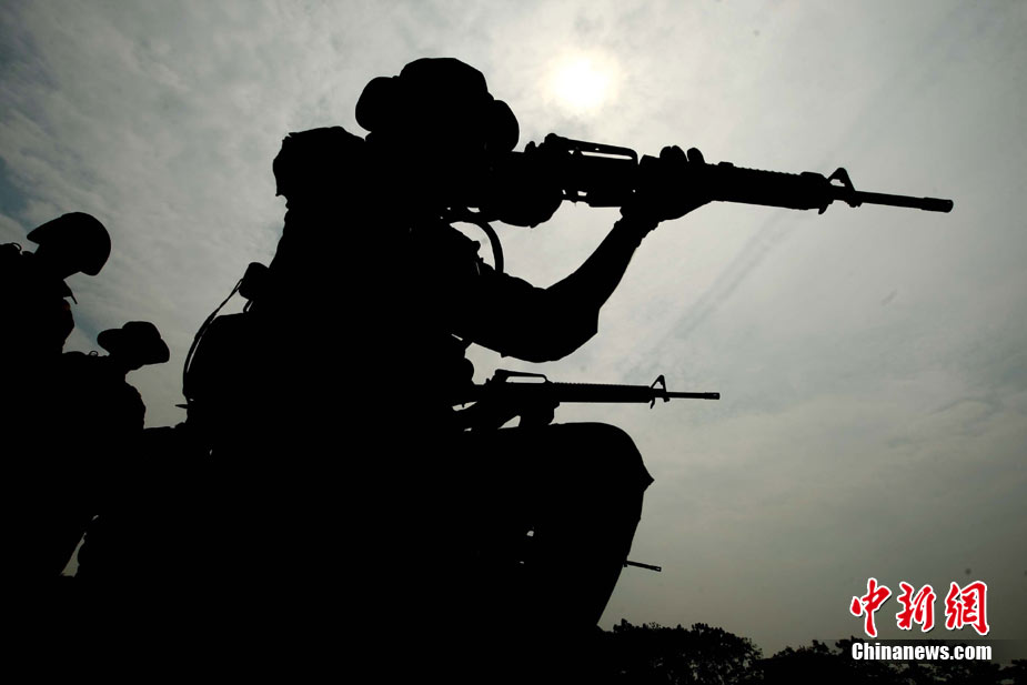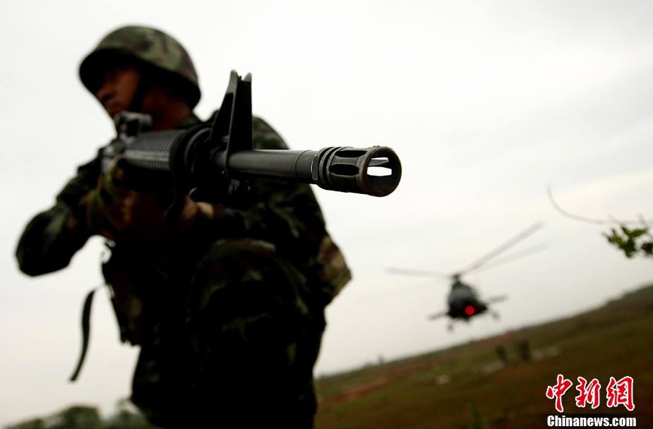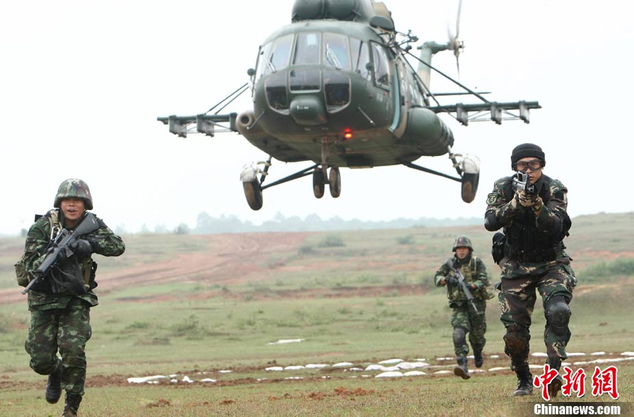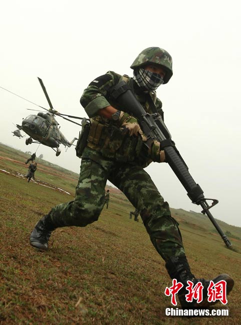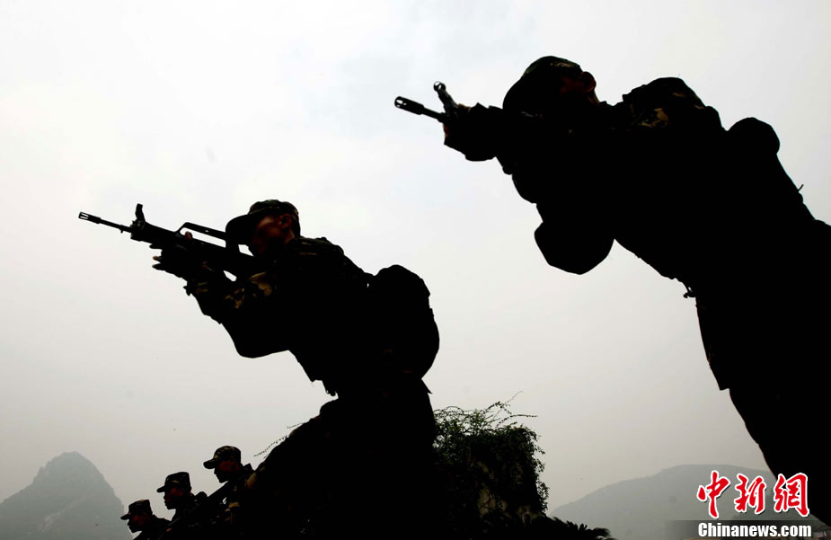 10月8日,中國(guó)、泰國(guó)兩軍特種部隊(duì)“突擊—2010”反恐聯(lián)合訓(xùn)練在廣西桂林拉開帷幕,這是兩國(guó)之間舉行的第三次陸軍聯(lián)合訓(xùn)練。分析人士指出,這次聯(lián)訓(xùn)將進(jìn)一步鞏固兩軍關(guān)系,提高聯(lián)合反恐作戰(zhàn)能力,利于維護(hù)地區(qū)和平穩(wěn)定。此次聯(lián)訓(xùn)為期15天,這是中泰兩國(guó)陸軍首次就城市反恐課題開展聯(lián)訓(xùn)。圖為中國(guó)參訓(xùn)部隊(duì)在開幕式上表演房屋突擊。中新社記者 杜洋 攝
