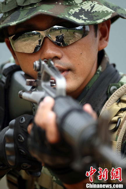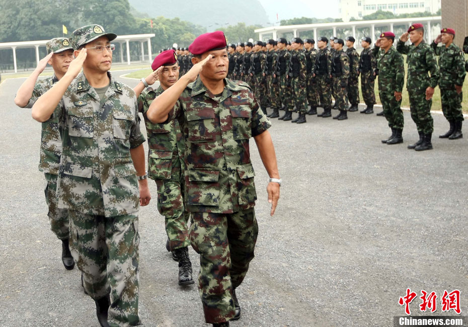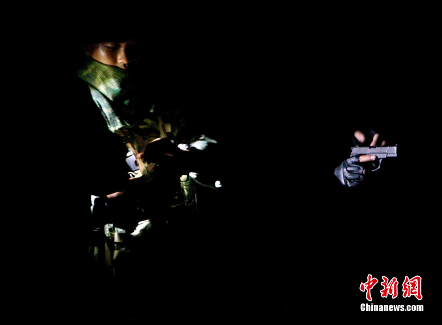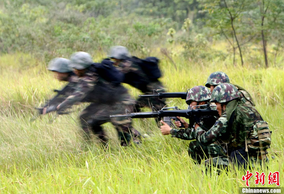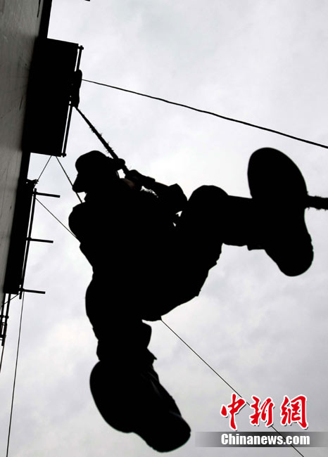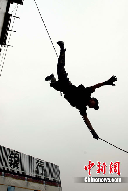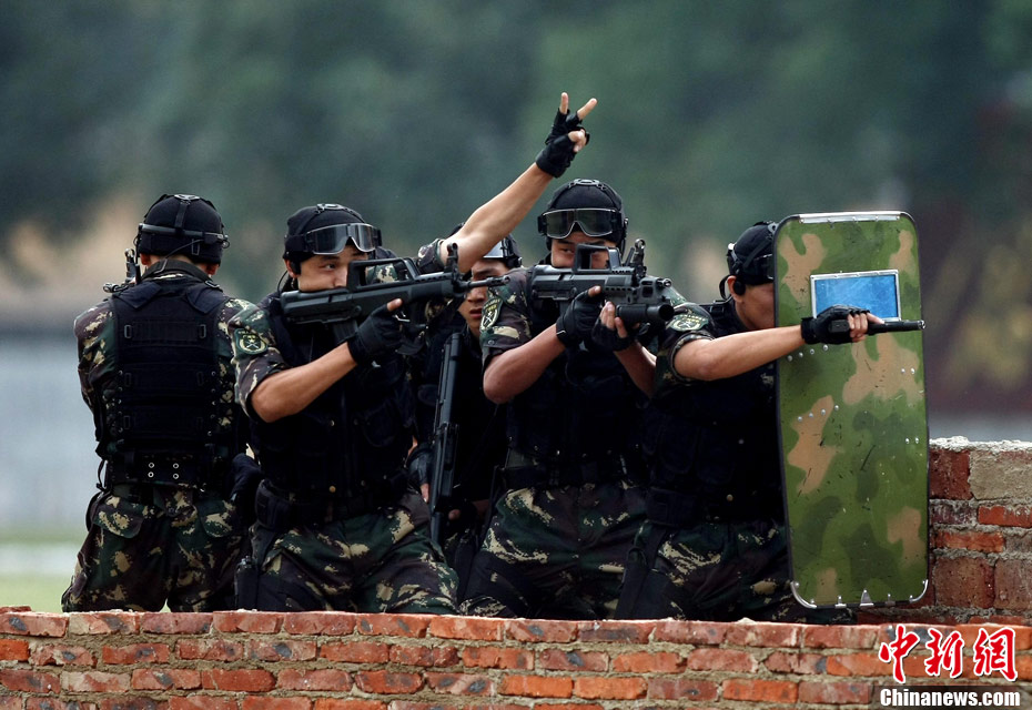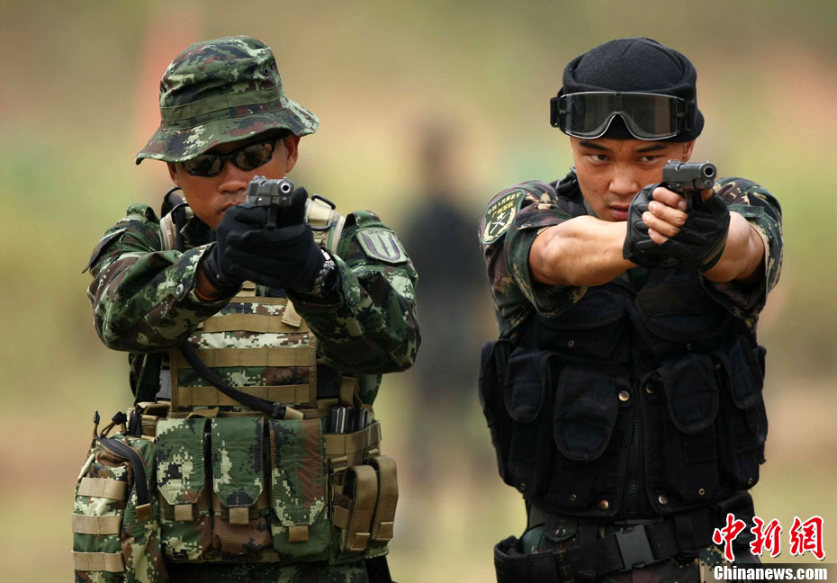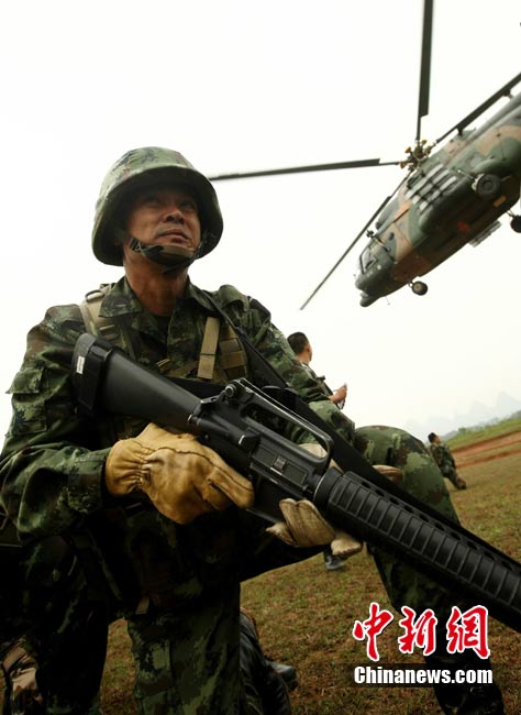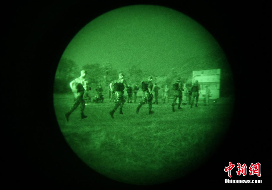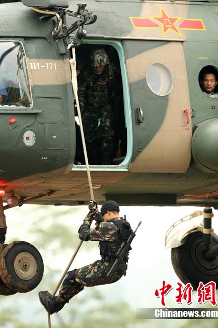 10月8日,中國(guó)、泰國(guó)兩軍特種部隊(duì)“突擊—2010”反恐聯(lián)合訓(xùn)練在廣西桂林拉開帷幕,這是兩國(guó)之間舉行的第三次陸軍聯(lián)合訓(xùn)練。分析人士指出,這次聯(lián)訓(xùn)將進(jìn)一步鞏固兩軍關(guān)系,提高聯(lián)合反恐作戰(zhàn)能力,利于維護(hù)地區(qū)和平穩(wěn)定。此次聯(lián)訓(xùn)為期15天,這是中泰兩國(guó)陸軍首次就城市反恐課題開展聯(lián)訓(xùn)。圖為中國(guó)參訓(xùn)部隊(duì)在開幕式上表演房屋突擊。中新社記者 杜洋 攝