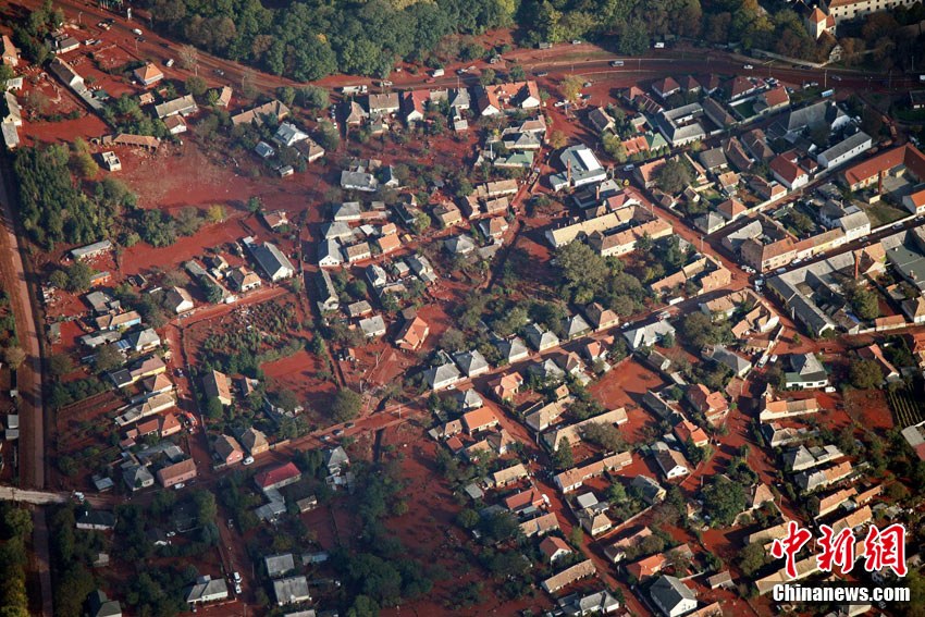 這張10月7日航拍的照片顯示,在匈牙利維斯普雷姆州奧伊考,鋁廠廢水池的堤壩毀壞,由此引發(fā)紅色有毒廢水泄漏。該鋁廠4日發(fā)生有毒廢水泄漏事故,目前已造成4人死亡,廢水7日上午流入多瑙河支流莫雄多瑙河。