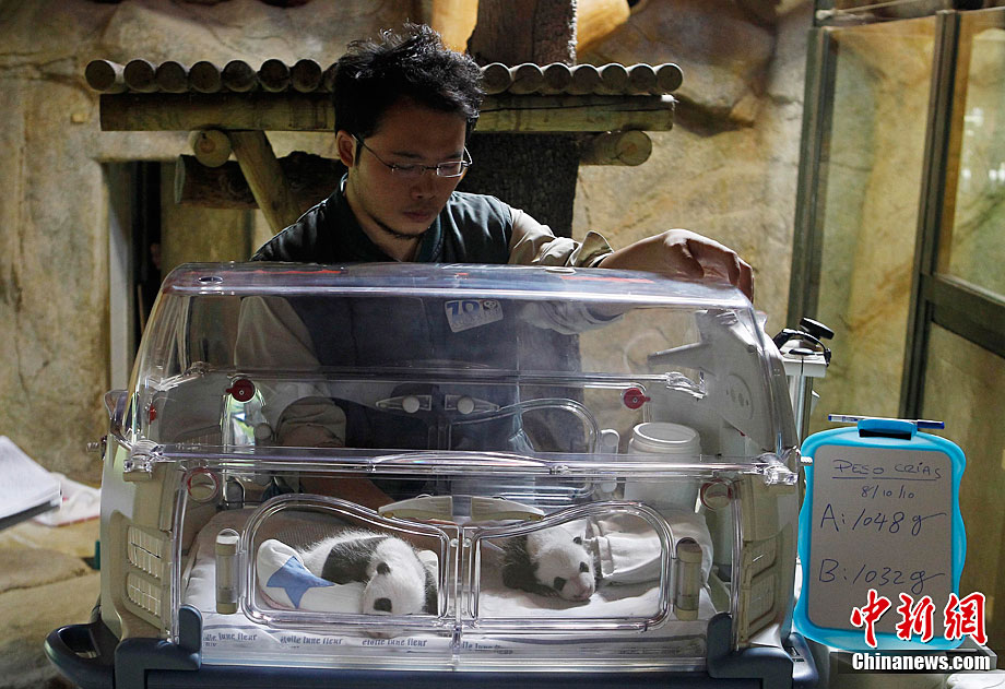 當(dāng)?shù)貢r(shí)間10月8日,西班牙馬德里動(dòng)物園出生的兩只人工受精的大熊貓幼崽第一次向媒體亮相。這對(duì)雙胞胎均為雄性,9月7日出生時(shí)他們的體重只有5盎司(141.5克)。經(jīng)過不斷的護(hù)理,它們現(xiàn)在體重已超過1公斤,并可以向媒體亮相了。