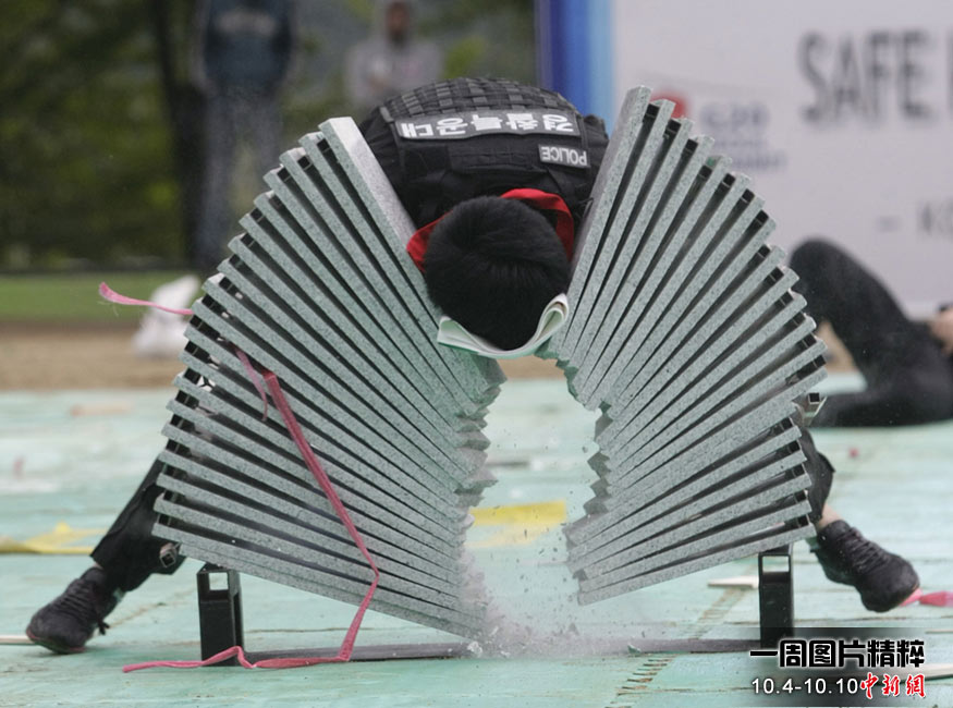 10月4日(周一),一名警務(wù)人員在首爾警員訓(xùn)練中心示范用頭撞碎多層石板。