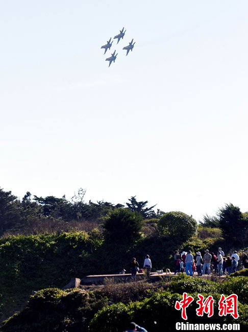 當(dāng)?shù)貢r間10月9日下午,美國海軍藍(lán)天使飛行表演隊(duì)在舊金山舉行一年一度的“艦隊(duì)周”活動。圖為5架F-18戰(zhàn)斗機(jī)編隊(duì)表演。 中新社發(fā) 陳鋼 攝