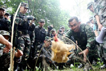 10月11日,中泰陸軍特種部隊(duì)反恐聯(lián)合訓(xùn)練交流野外生存技巧。“突擊-2010”中泰陸軍特種部隊(duì)反恐聯(lián)合訓(xùn)練于10月6日至20日在廣西壯族自治區(qū)桂林進(jìn)行。圖為展示用竹子制作的捕獸陷阱。中新社記者 杜洋 攝