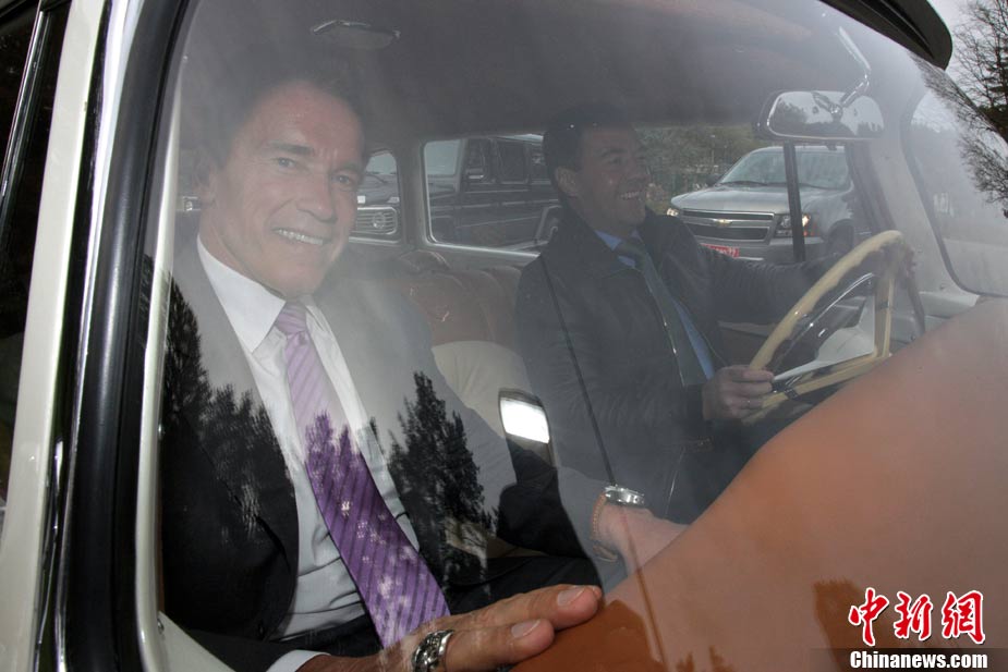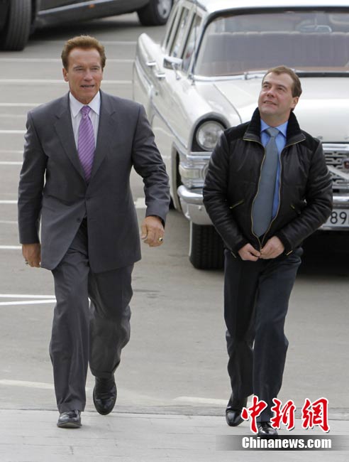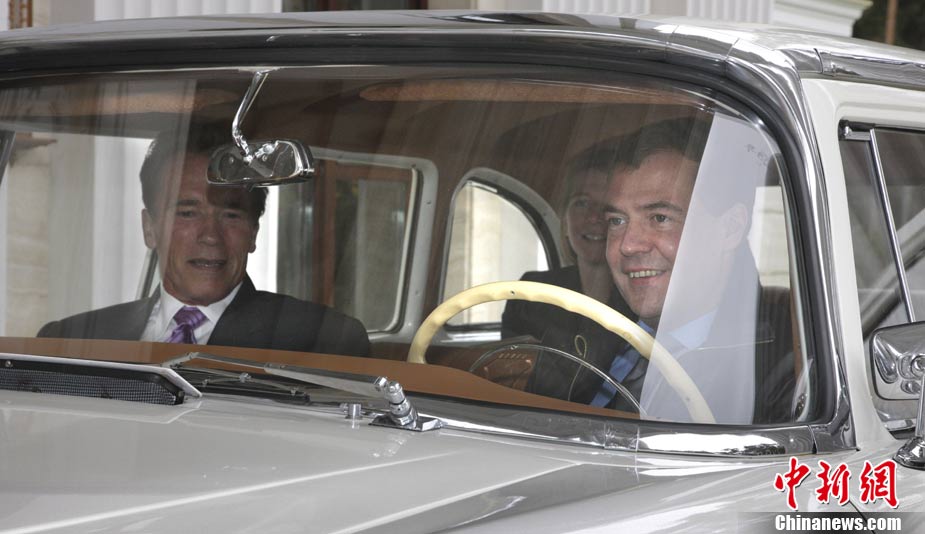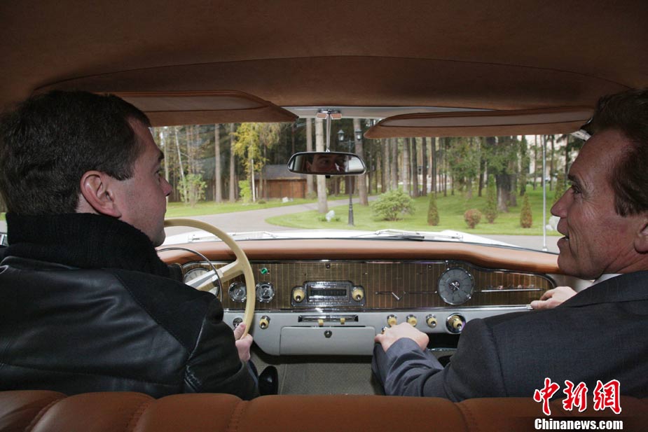 10月11日,莫斯科,美國加州州長施瓦辛格訪問俄羅斯,與俄羅斯總統(tǒng)梅德韋杰夫會面。梅德韋杰夫總統(tǒng)還為施瓦辛格客串了一把“司機(jī)!