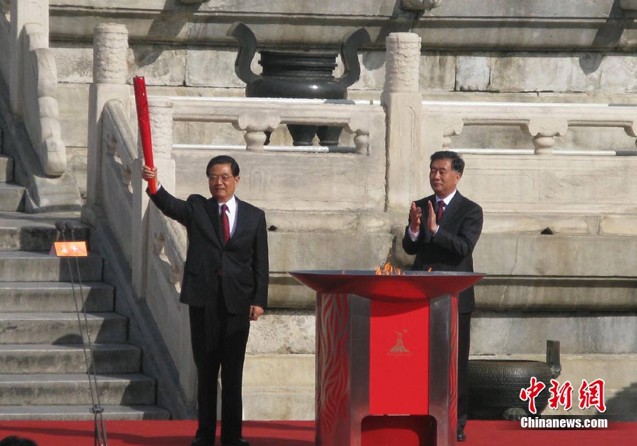 10月12日上午,廣州亞運(yùn)會火炬點(diǎn)燃暨傳遞啟動儀式在北京天壇祈年殿南廣場舉行。10點(diǎn)17分,中共中央總書記、國家主席胡錦濤點(diǎn)燃主火炬。 中新社記者 沈晨 攝