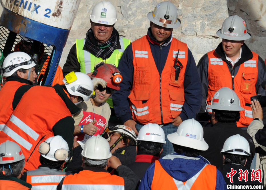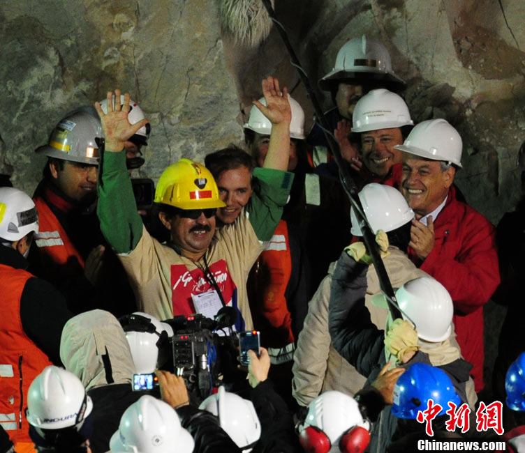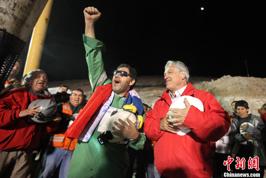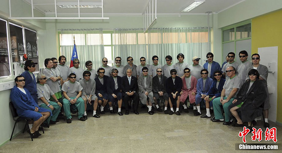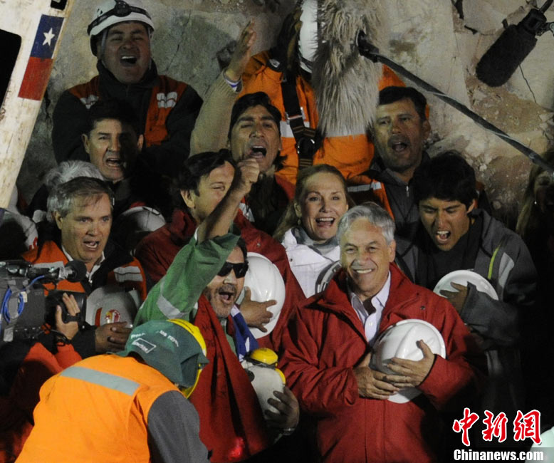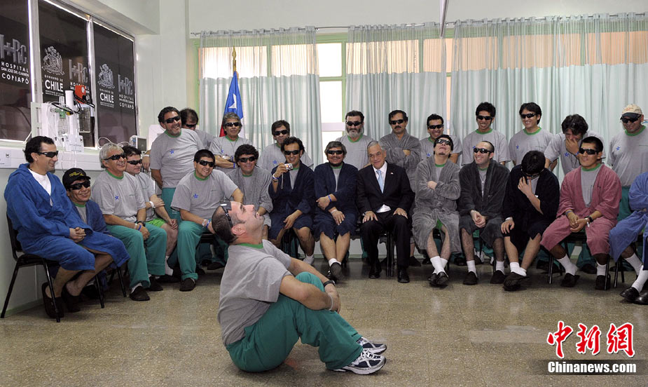 10月14日,智利總統(tǒng)皮涅拉會(huì)見了所有33名圣何塞銅礦獲救的被困礦工。33位在礦井下被困兩個(gè)多月的礦工周三被全部救出。據(jù)醫(yī)生說,這些獲救礦工的大多數(shù)健康狀況良好。
