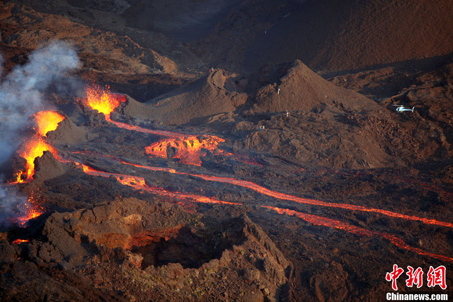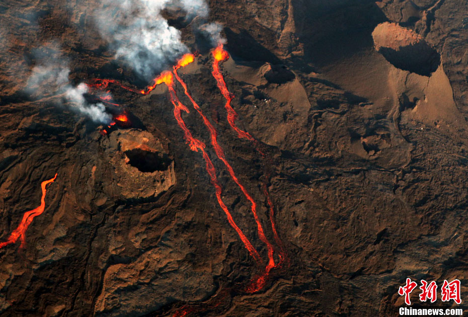 2010年10月14日,法國留尼旺島上的弗爾乃斯火山(Piton de la Fournaise)開始噴發(fā)熔巖流。圖為鳥瞰該火山噴發(fā)出的熔巖流。位于印度洋西南部的弗爾乃斯火山是世界上最活躍的活火山之一。