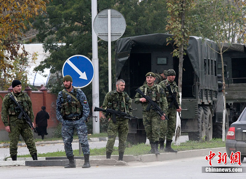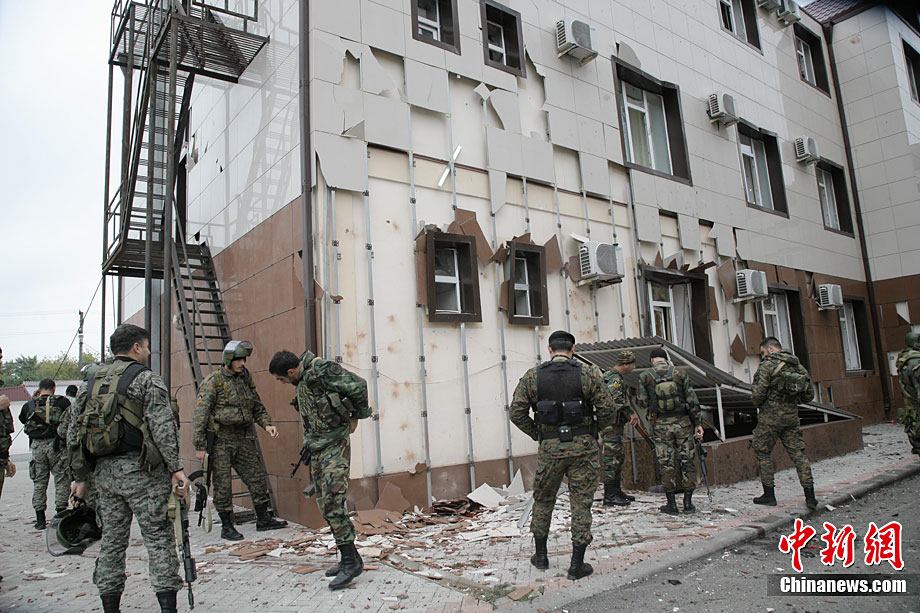 當(dāng)?shù)貢r(shí)間10月19日,俄羅斯車臣共和國(guó)首府格羅茲尼市列寧區(qū)的車臣議會(huì)大樓遭到武裝分子襲擊,造成2人死亡。圖為安全部隊(duì)在消滅完襲擊份子后,準(zhǔn)備撤離議會(huì)大樓。