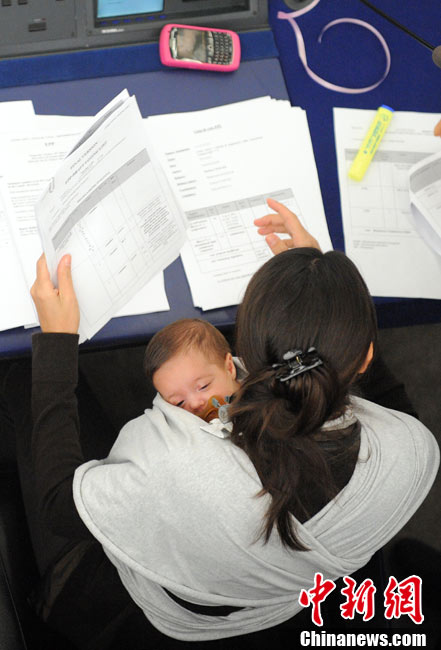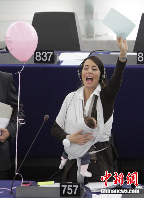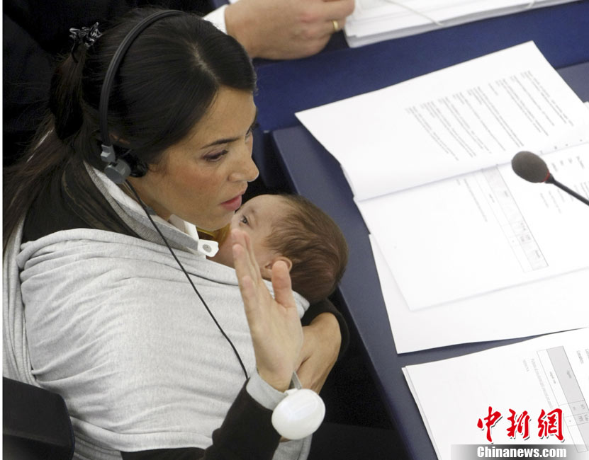 10月20日,歐洲議會(huì)在法國的斯特拉斯堡為延長產(chǎn)假的提案舉行投票,代表麗希亞·隆蘇依帶著孩子出席會(huì)議。