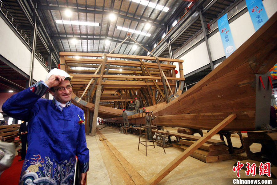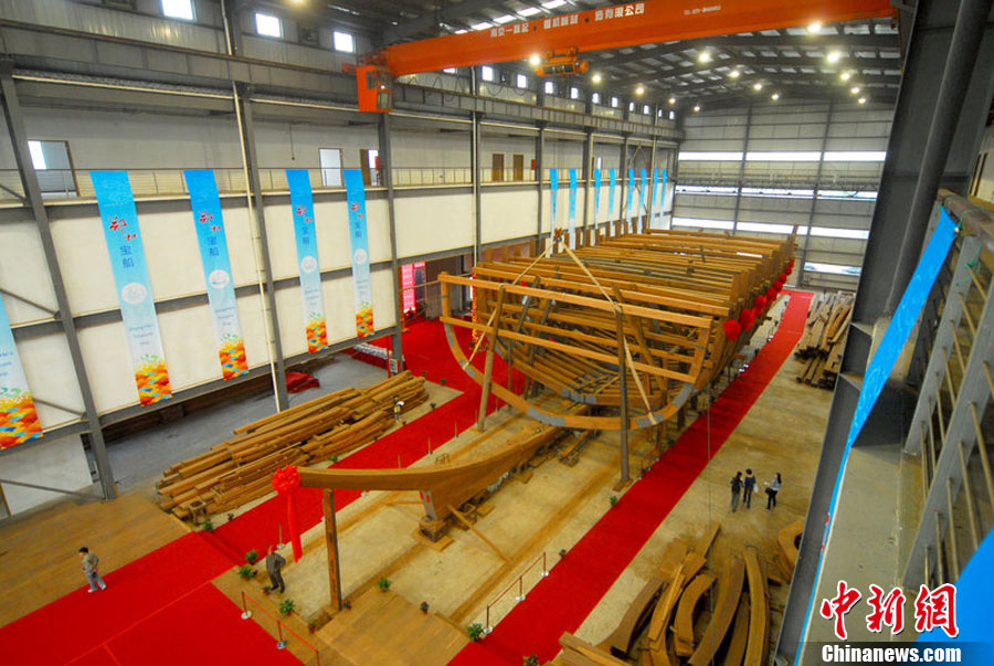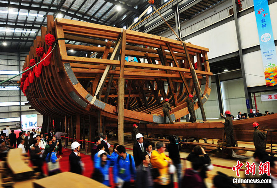 10月20日,南京,作為“2010年南京名城會”的序曲,“鄭和寶船復(fù)建慶典”在鄭和寶船廠舉行,主體已經(jīng)完工1/3的“鄭和寶船”露出“廬山真面目”。這座鄭和寶船將在明年9月船體竣工,2013年將沿著鄭和當(dāng)年的航海路線“環(huán)球航行”。圖為復(fù)建的寶船進(jìn)行了肋骨安放儀式。邵丹 攝 圖片來源:CFP視覺中國