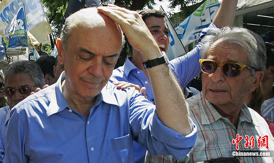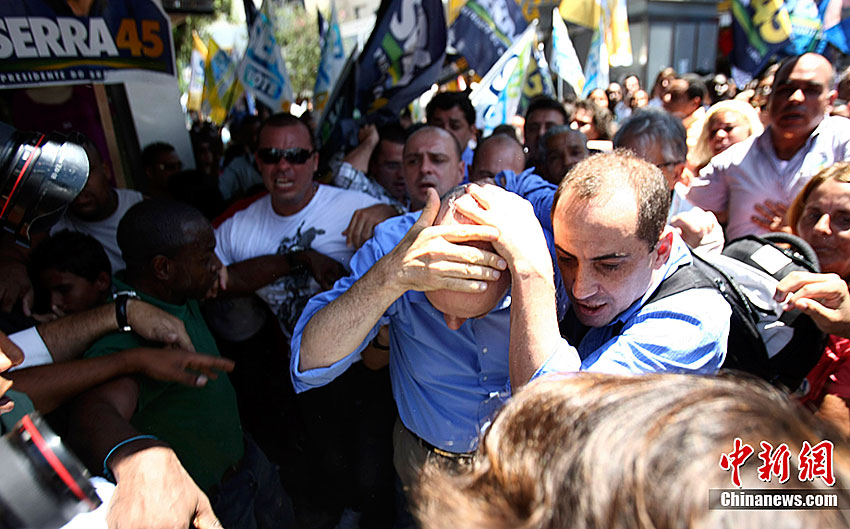 當(dāng)?shù)貢r(shí)間10月20日,在巴西里約熱內(nèi)盧以西,社會(huì)民主黨總統(tǒng)候選人若澤·塞拉在參加一場(chǎng)競(jìng)選宣傳活動(dòng)時(shí)被不明投擲物擊中頭部,隨后在安保人員和支持者的護(hù)送下離開(kāi)了現(xiàn)場(chǎng)。