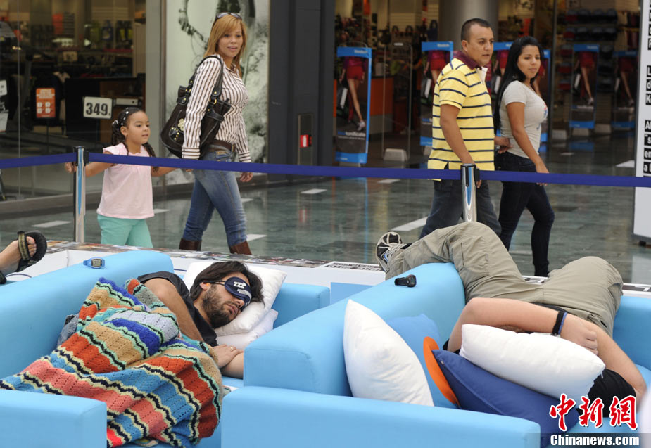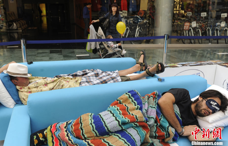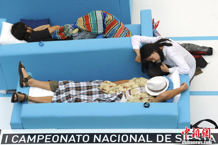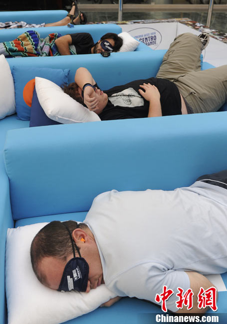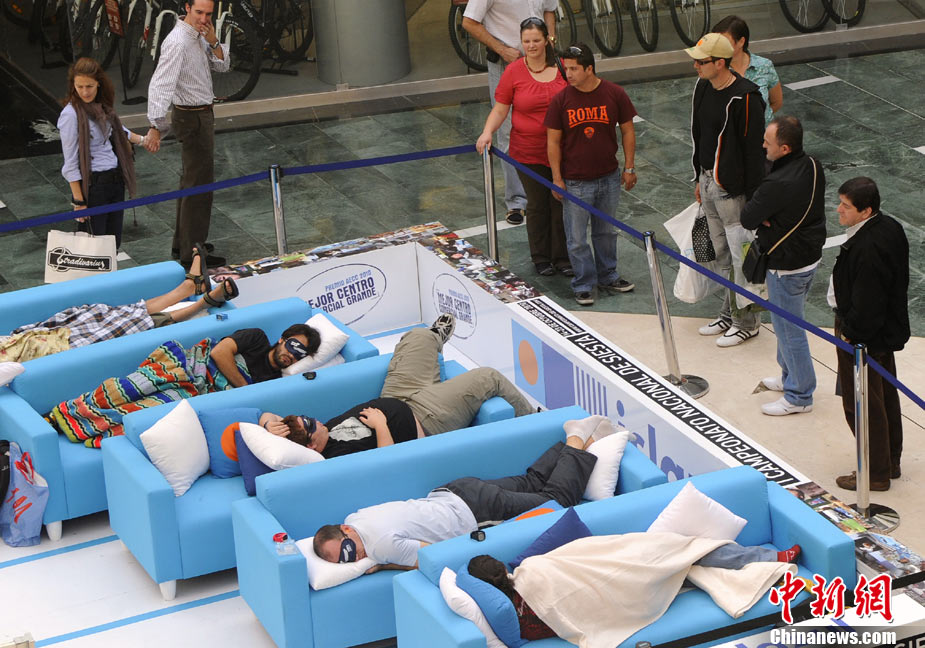 10月21日,在西班牙馬德里的一家商場內(nèi),舉行了一場奇特的“打盹大賽”。眾多選手展開了睡覺的比拼,并且有專門的裁判來監(jiān)督選手是否“作弊”。