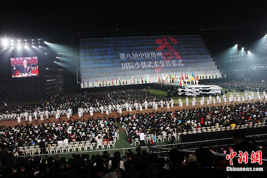 10月22日晚,“金身和尚”在國際少林武術(shù)節(jié)開幕式上表演。當(dāng)日,第八屆中國鄭州國際少林武術(shù)節(jié)在鄭州開幕。來自美國、法國、日本、及港澳臺等近60個國家和地區(qū)的1200名選手將在武術(shù)節(jié)期間同臺競技。中新社記者 王中舉 攝