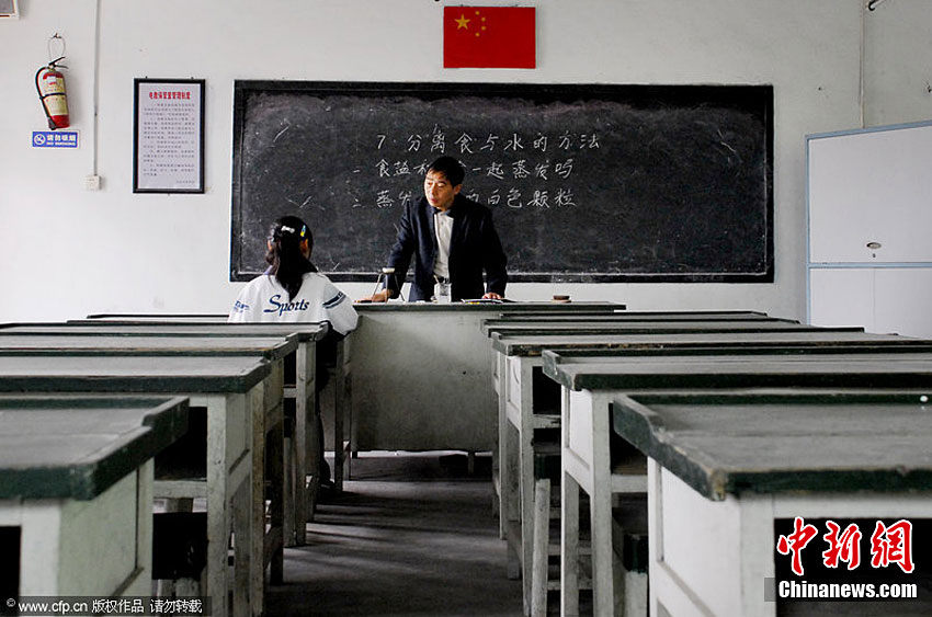 成都郫縣清水小學(xué)搬遷前夕,一位學(xué)生因家中搬遷原因未轉(zhuǎn)校,學(xué)校將為其授課到最后。她叫孫悅,讀4年級(jí)。每天早上8點(diǎn)多,她一個(gè)人來(lái)到學(xué)校,下午4點(diǎn)多,她又一個(gè)人回家。只有她的自行車(chē),能一路陪著她。教室里,除了她只有老師。和孫悅一樣留守學(xué)校的,還有19名老師。老師們?cè)缟蟻?lái)到學(xué)校的第一件事,是打掃衛(wèi)生。原來(lái)由一個(gè)班負(fù)責(zé)的公共區(qū)域,現(xiàn)在完全由老師來(lái)負(fù)責(zé)。位于成都郫縣德源鎮(zhèn)勝利村的清水小學(xué),全校目前只有1個(gè)學(xué)生在校讀書(shū),老師仍按照原定課表,為其上課。這種類(lèi)似“家教一對(duì)一式”的教學(xué)方式,已整整持續(xù)了一周。圖片來(lái)源:CFP視覺(jué)中國(guó)