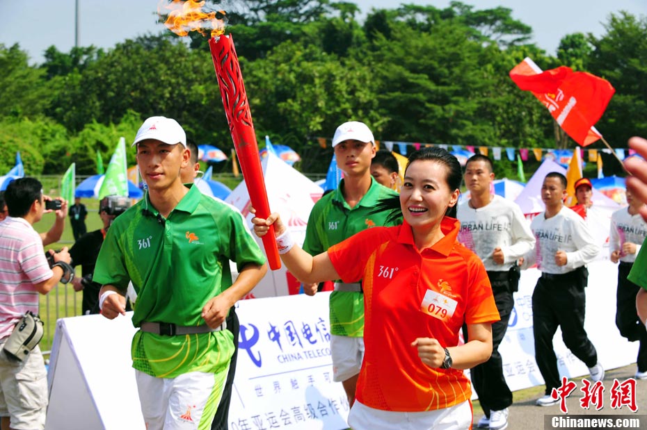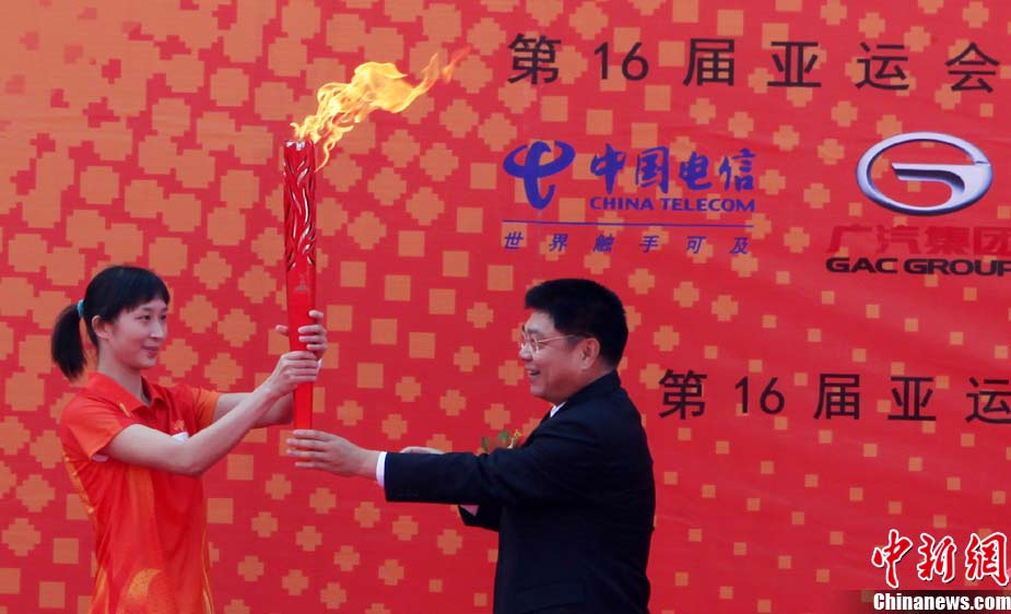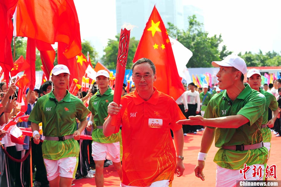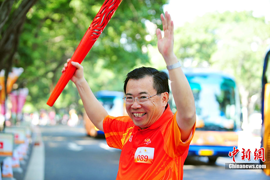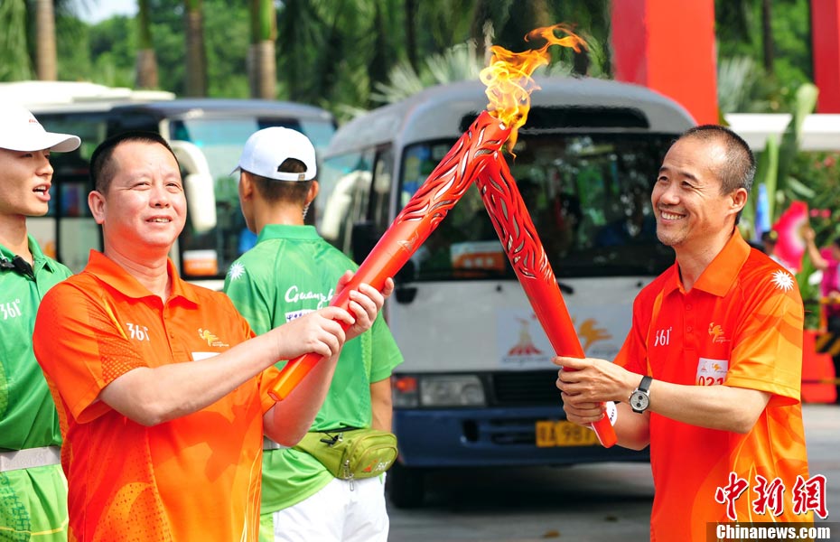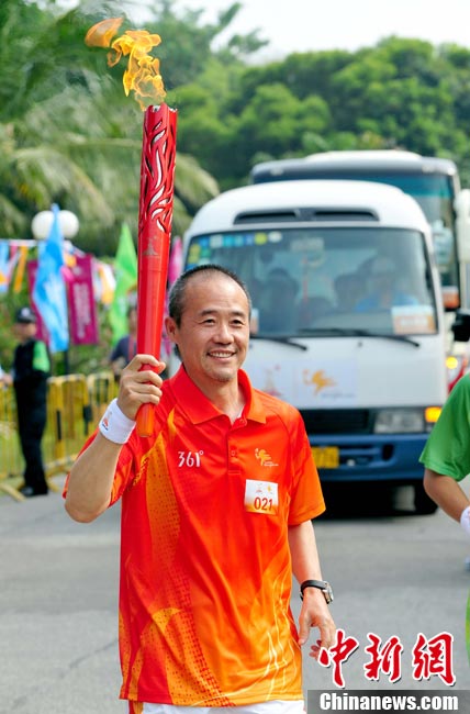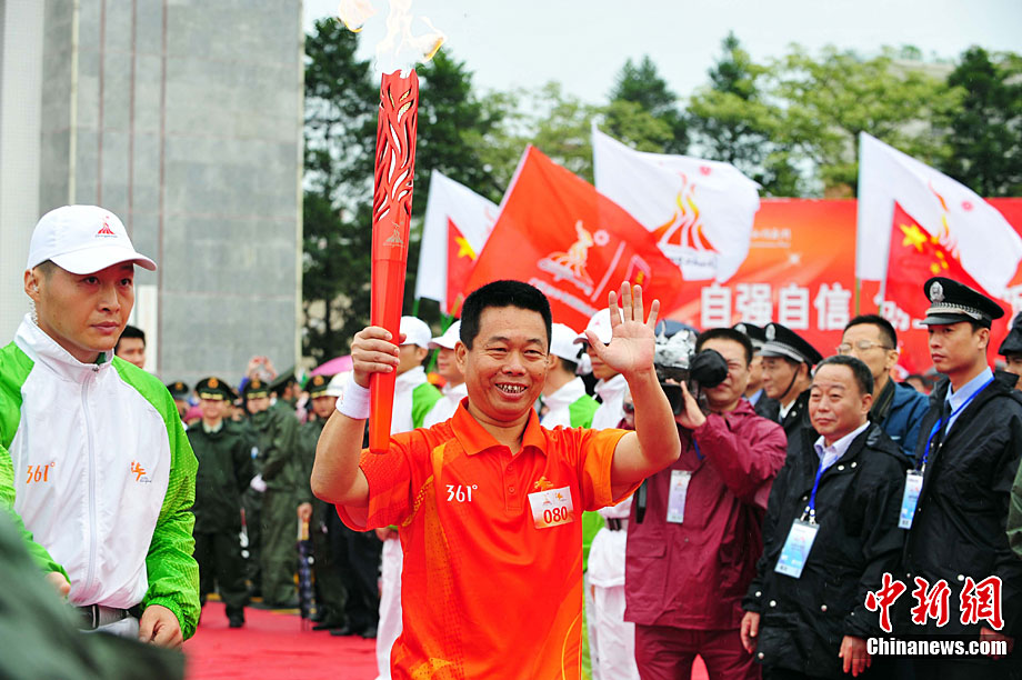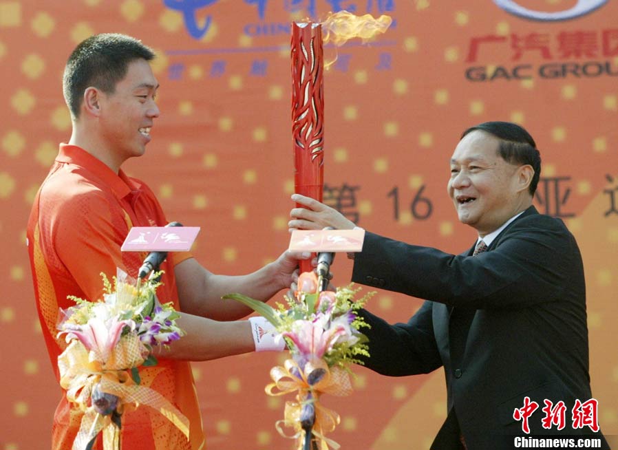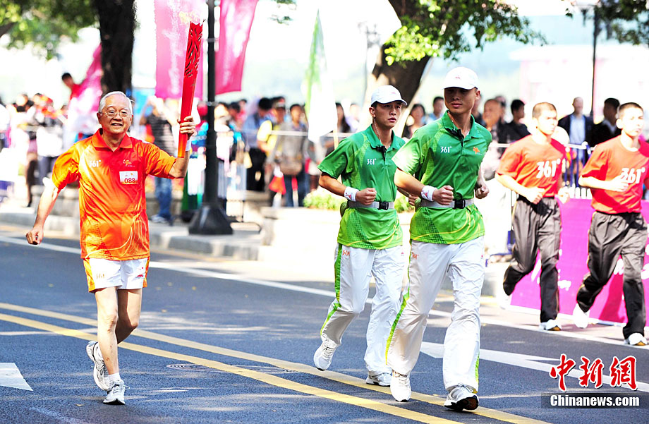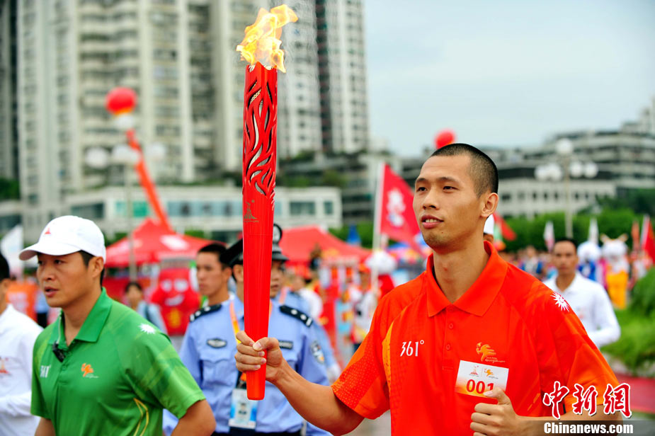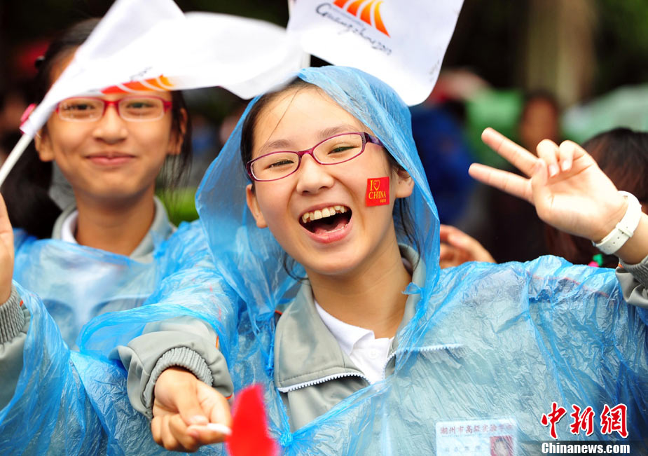 10月23日,超強(qiáng)臺(tái)風(fēng)“鲇魚”來襲,第16屆亞運(yùn)廣東揭陽站80名火炬手在榕江兩岸頂風(fēng)冒雨傳遞圣火。圖為第80棒火炬手陳志強(qiáng)在傳遞亞運(yùn)圣火。中新社記者 陳文 攝