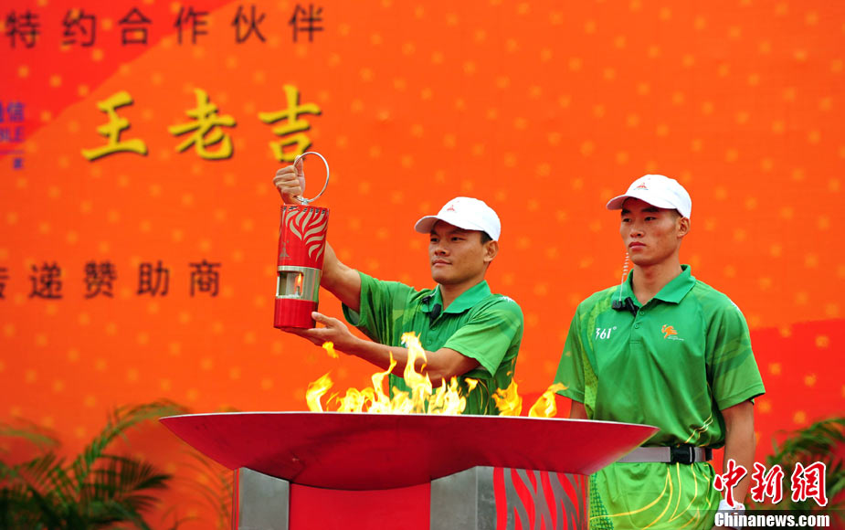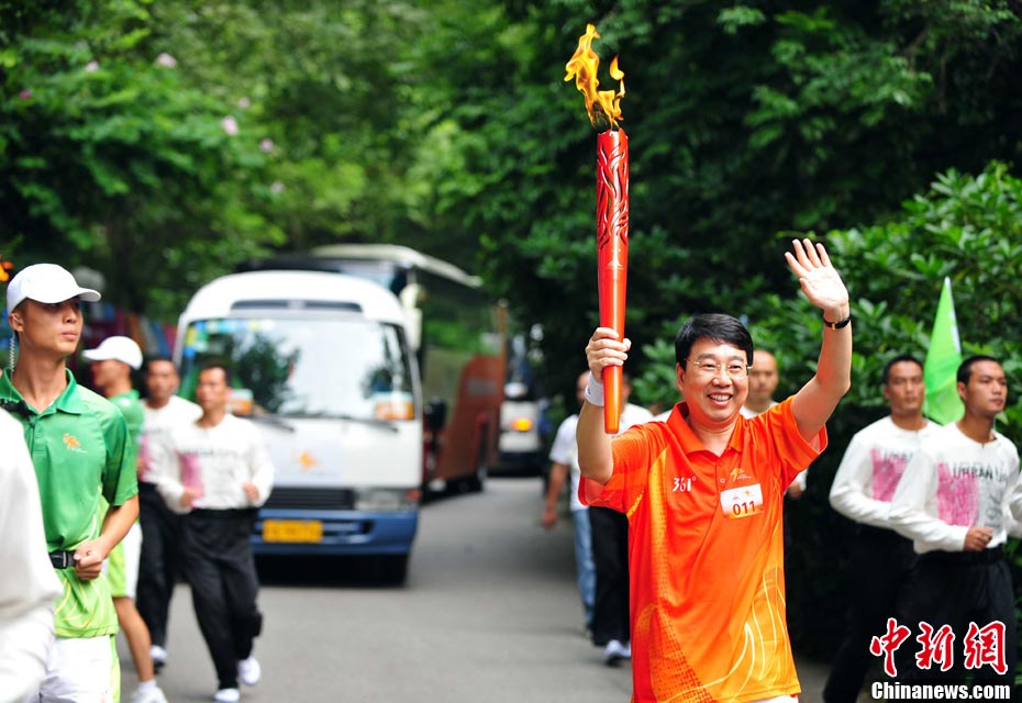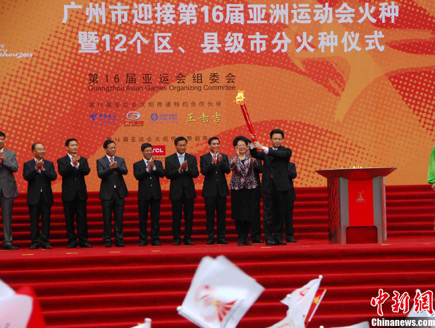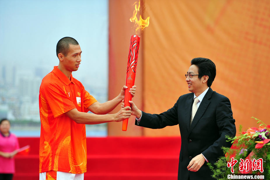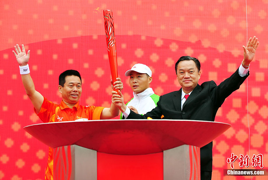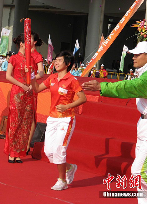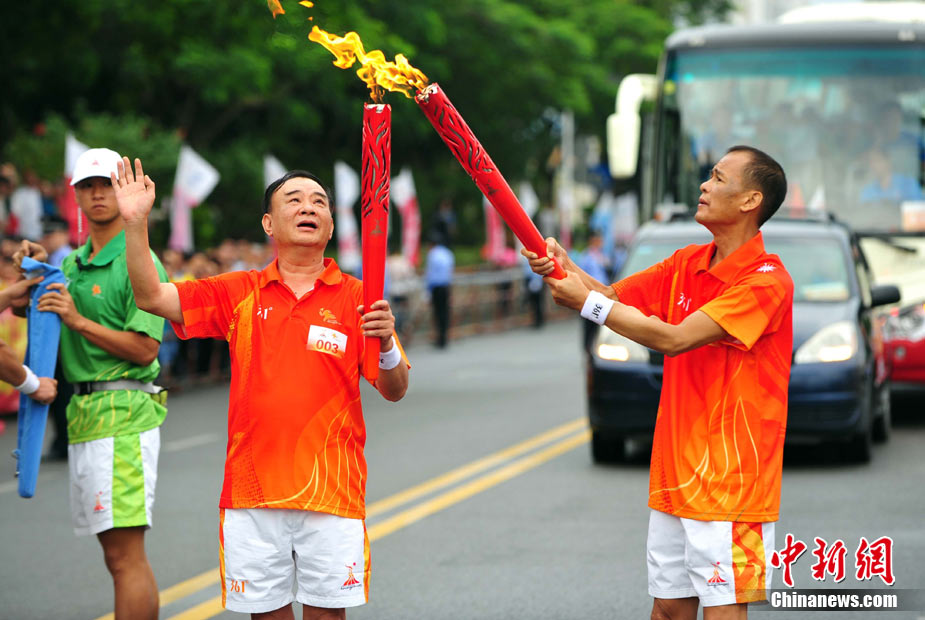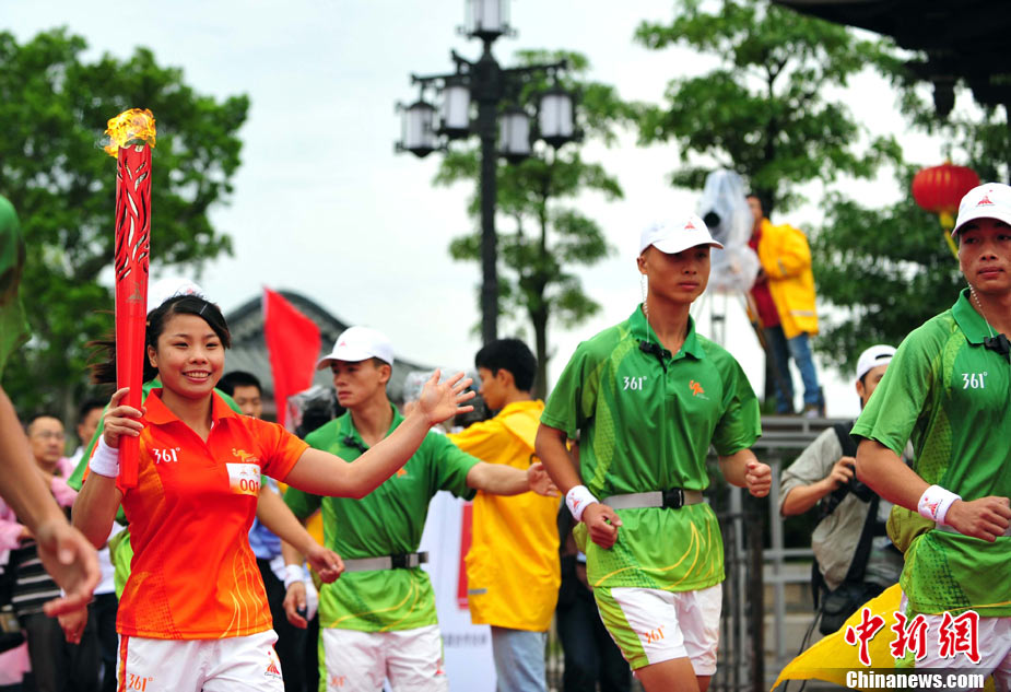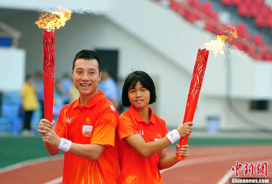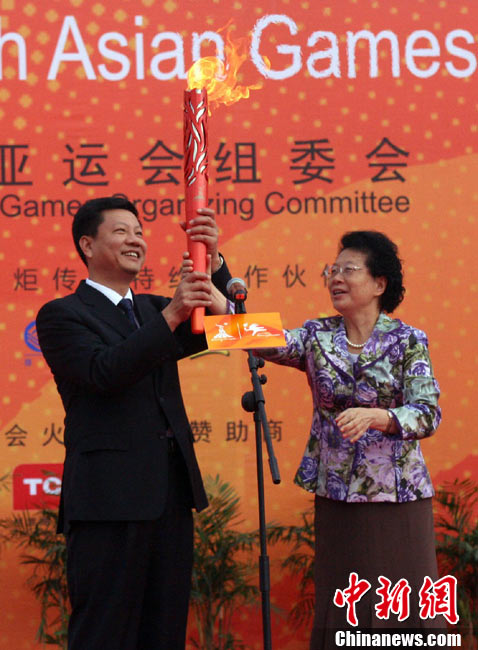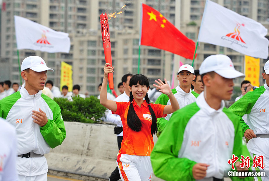 10月23日,超強(qiáng)臺(tái)風(fēng)“鲇魚”來襲,第16屆亞運(yùn)廣東揭陽站80名火炬手在榕江兩岸頂風(fēng)冒雨傳遞圣火。圖為第80棒火炬手陳志強(qiáng)在傳遞亞運(yùn)圣火。中新社記者 陳文 攝