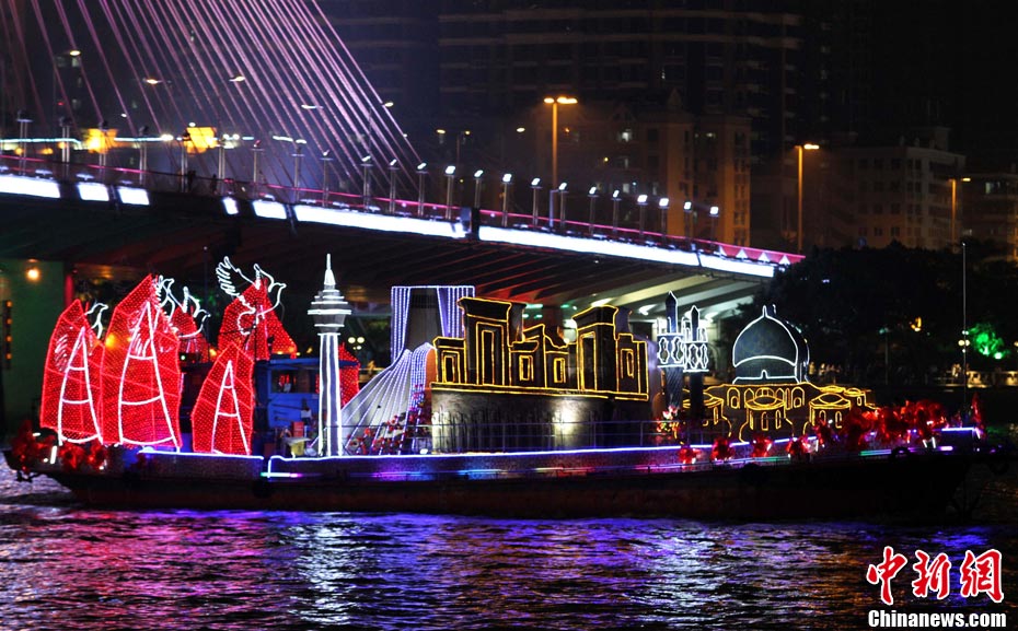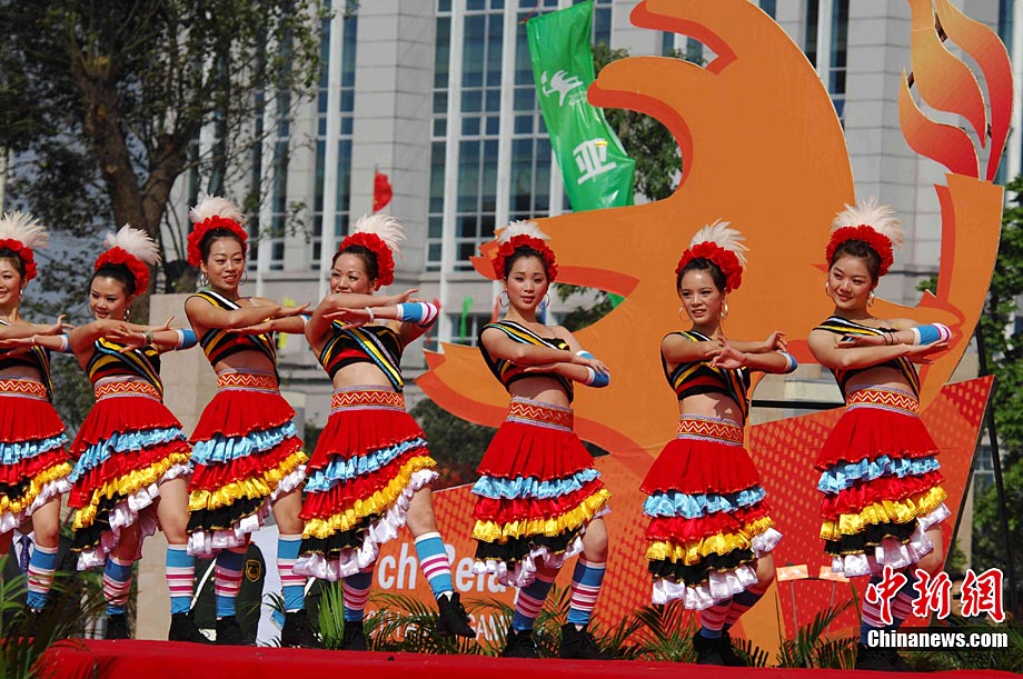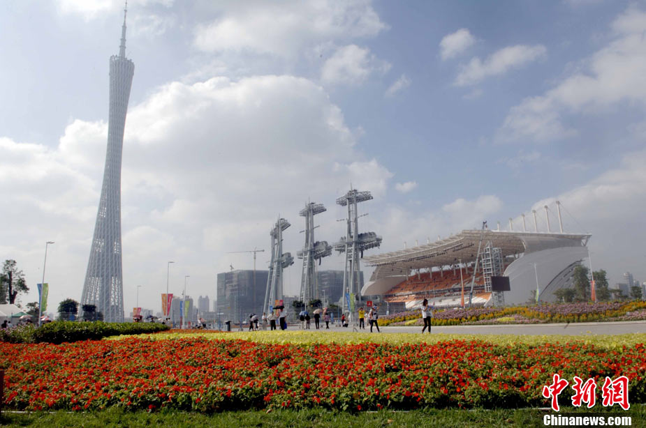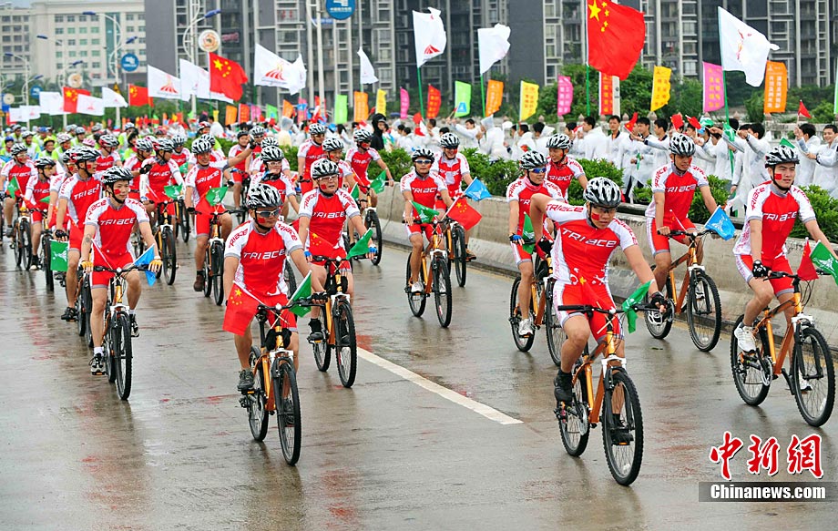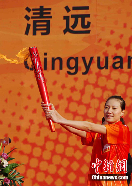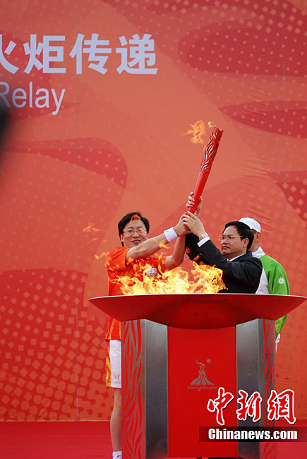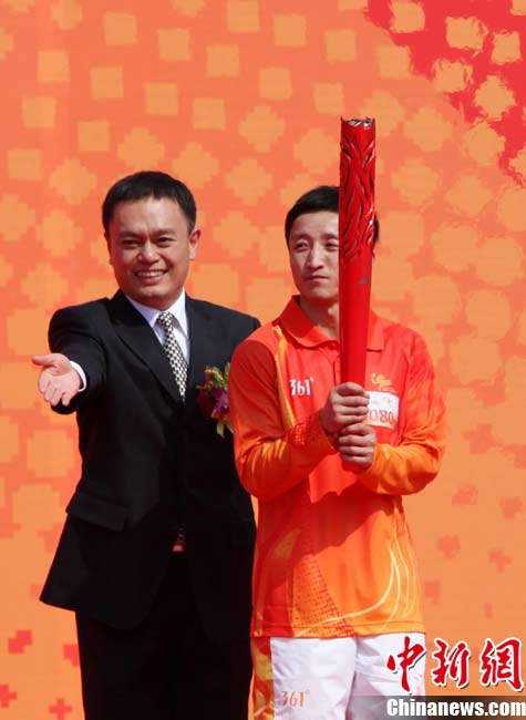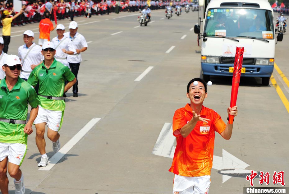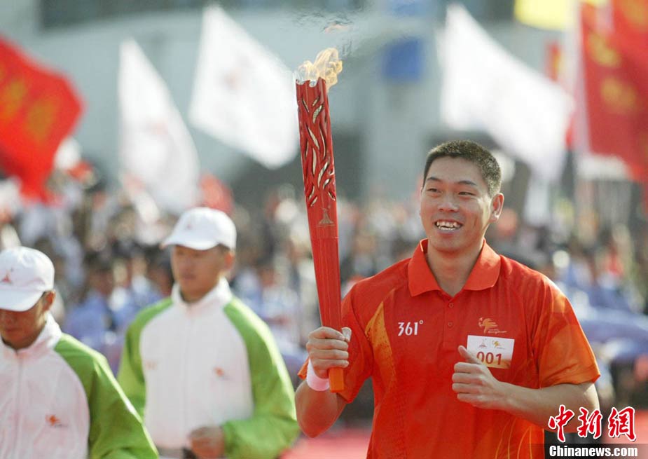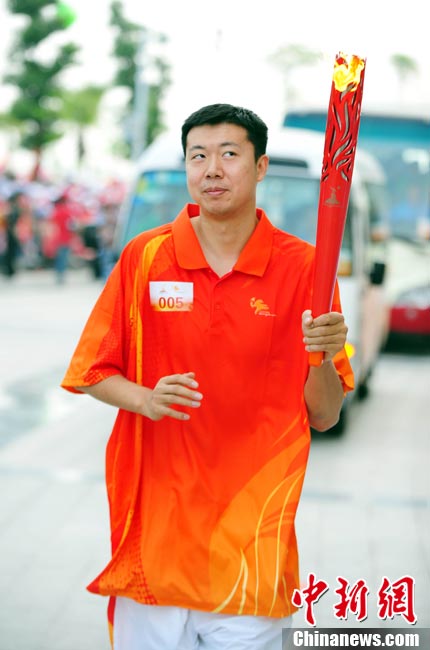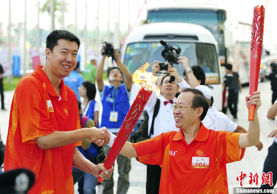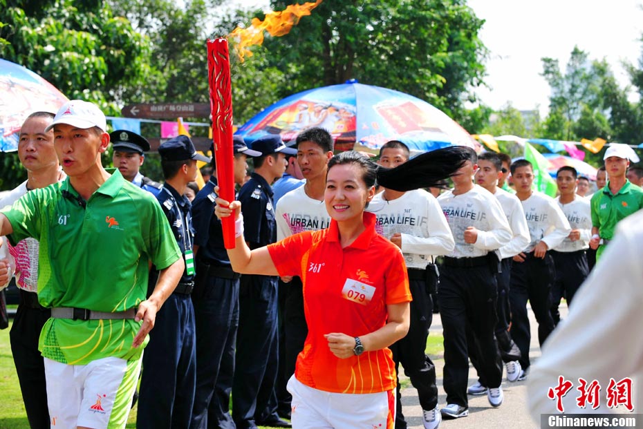 10月23日,超強(qiáng)臺(tái)風(fēng)“鲇魚”來襲,第16屆亞運(yùn)廣東揭陽站80名火炬手在榕江兩岸頂風(fēng)冒雨傳遞圣火。圖為第80棒火炬手陳志強(qiáng)在傳遞亞運(yùn)圣火。中新社記者 陳文 攝