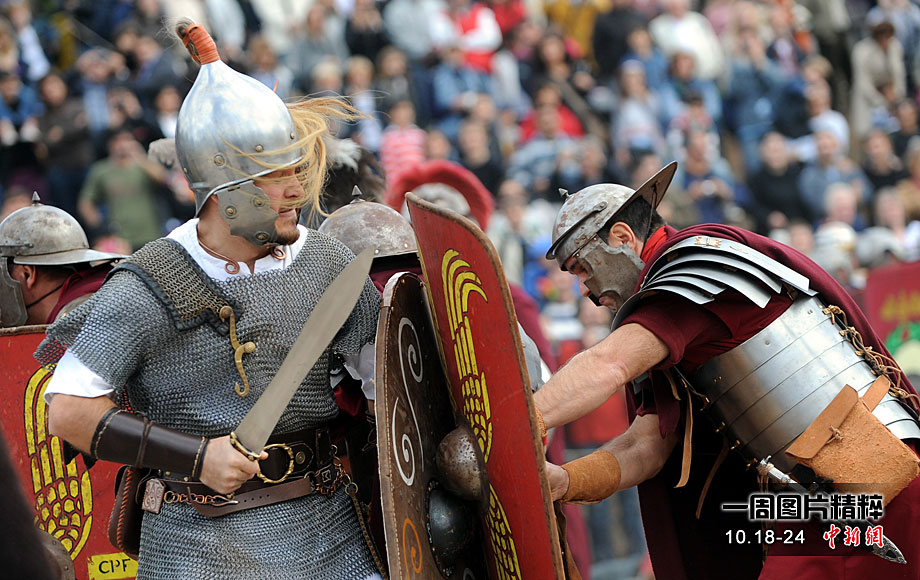 當(dāng)?shù)貢r(shí)間2010年10月17日,意大利羅馬的歷史愛好者和演員們再現(xiàn)了“古羅馬軍團(tuán)”和凱爾特人戰(zhàn)斗的場景,表演吸引了大批觀眾到場觀看。