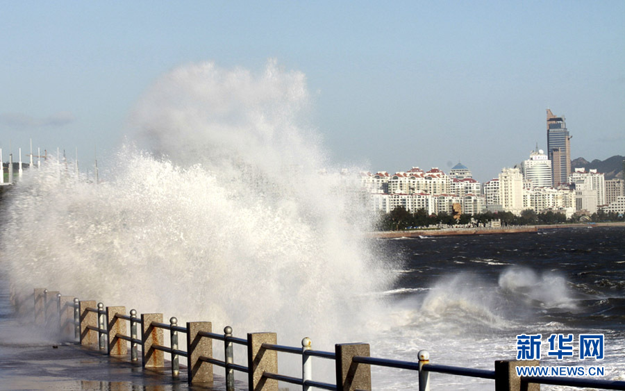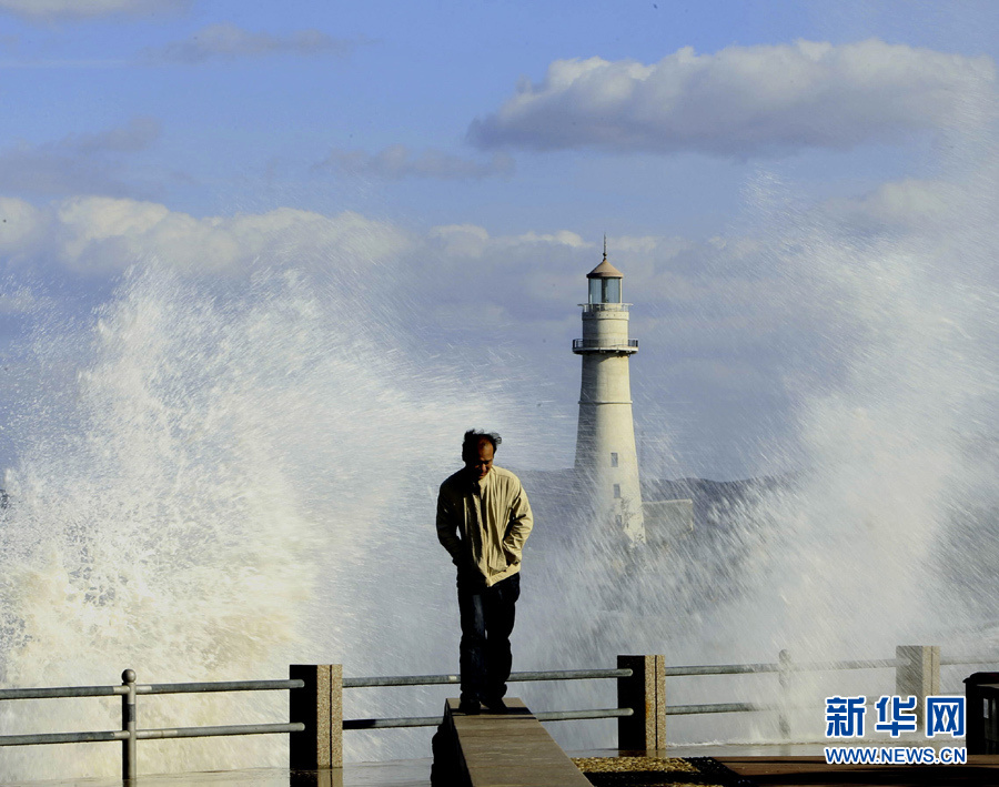 10月25日,一名行人從山東威海海濱掀起的浪花旁走過。當(dāng)日,受強冷空氣影響,山東威海海上風(fēng)力達(dá)8至9級,陣風(fēng)風(fēng)力達(dá)到11級,海濱大浪排空,威海市海上搜救中心發(fā)布海上風(fēng)險黃色預(yù)警。于啟波 攝 圖片來源:新華網(wǎng)