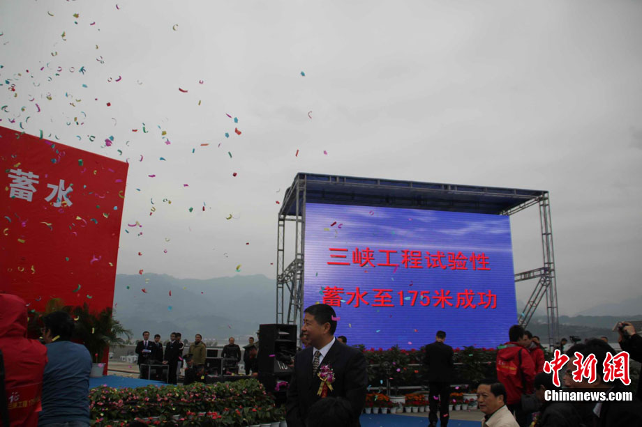 10月26日上午8時30分,在三峽大壩壩頂舉行了“見證三峽工程試驗性蓄水至175米儀式”,8時55分,中國長江三峽集團公司董事長曹廣晶宣布,三峽工程首次達到175米正常蓄水位,這標志三峽工程由初期運行期轉(zhuǎn)入正常運行期。劉良偉 攝