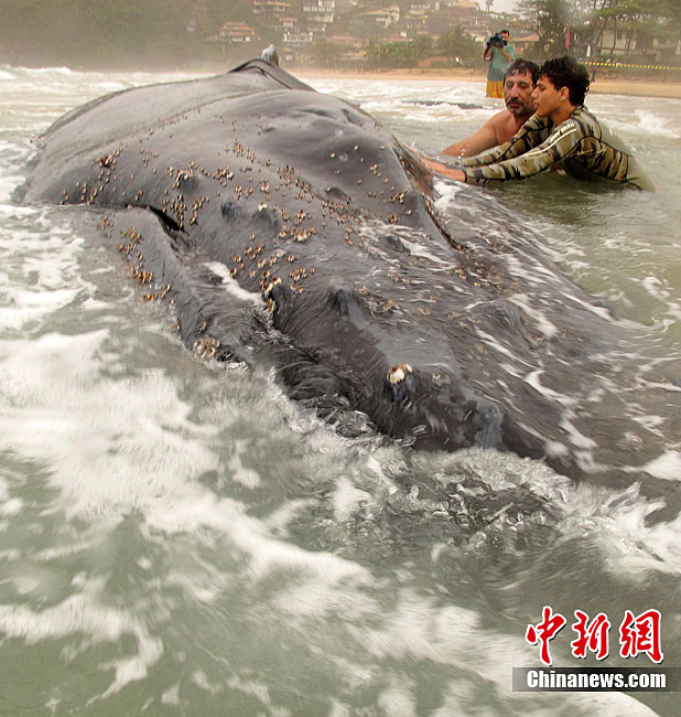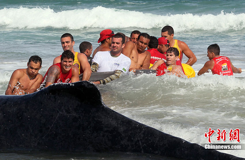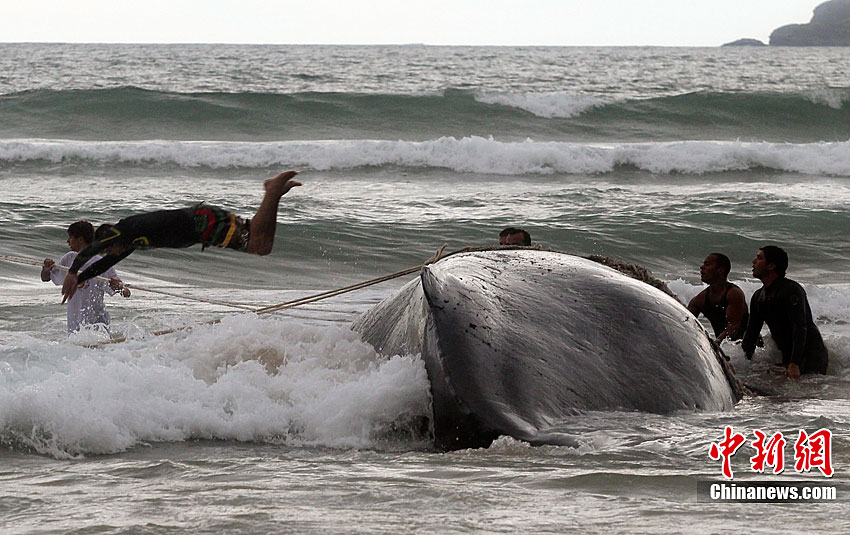 當(dāng)?shù)貢r(shí)間10月26日,在距離巴西里約熱內(nèi)盧192公里的布濟(jì)烏斯,救援人員試圖挪動(dòng)擱淺的座頭鯨。座頭鯨每年7月到11月從南極洲向北遷往巴西海域交配。
