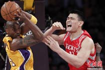當(dāng)?shù)貢r(shí)間10月26日,洛杉磯,10/11NBA常規(guī)賽,休斯頓火箭客場(chǎng)110-112惜敗衛(wèi)冕冠軍洛杉磯湖人。姚明出場(chǎng)23分21秒得到9分11個(gè)籃板,湖人隊(duì)科比拿下27分7次助攻。圖為洛杉磯湖人隊(duì)的加冕儀式在賽前隆重舉行。
