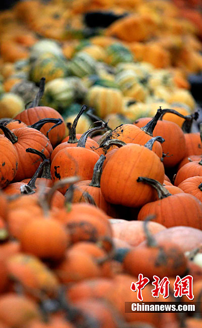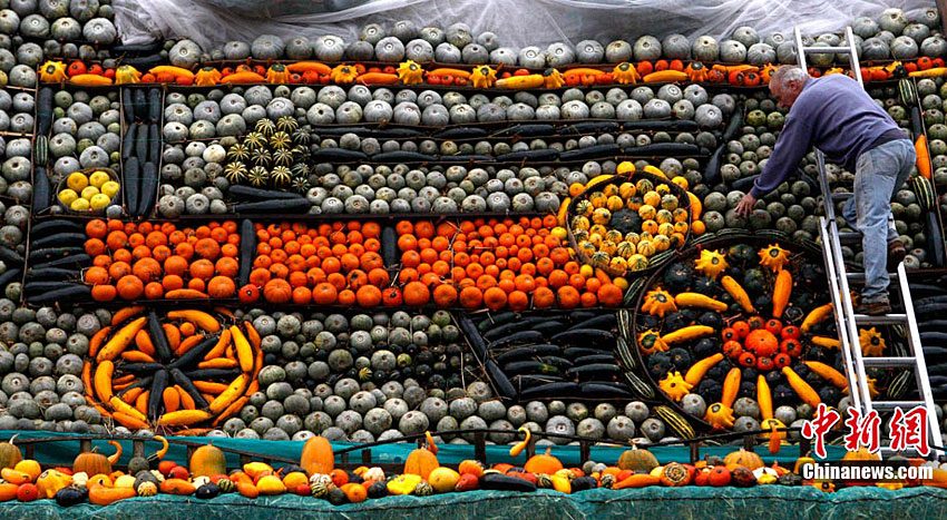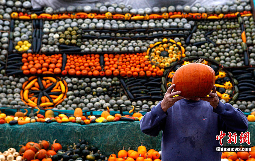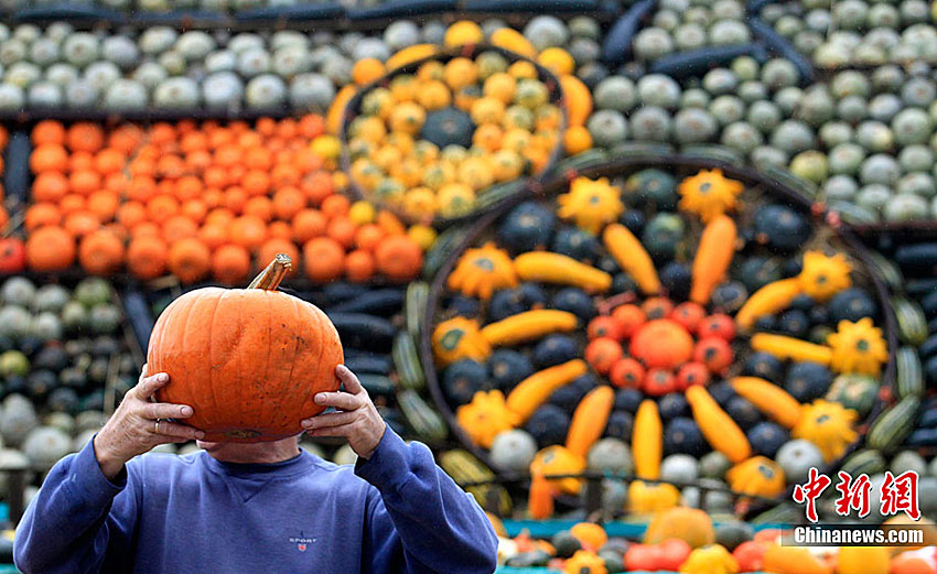 萬(wàn)圣節(jié)到來的前夕,英國(guó)斯林登老農(nóng)托尼·史密斯將自己種植數(shù)百只南瓜堆成牽引機(jī)車的模型。