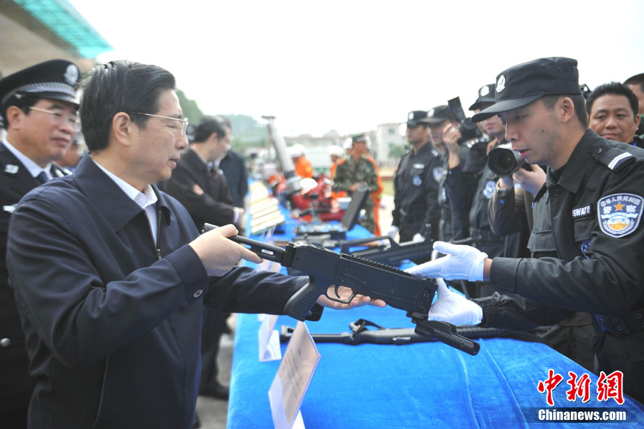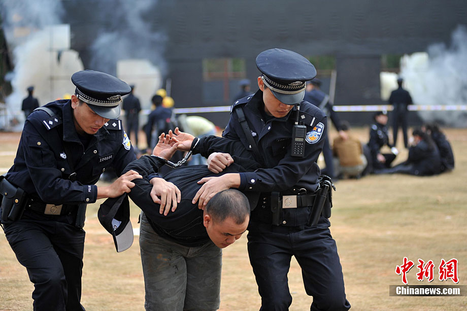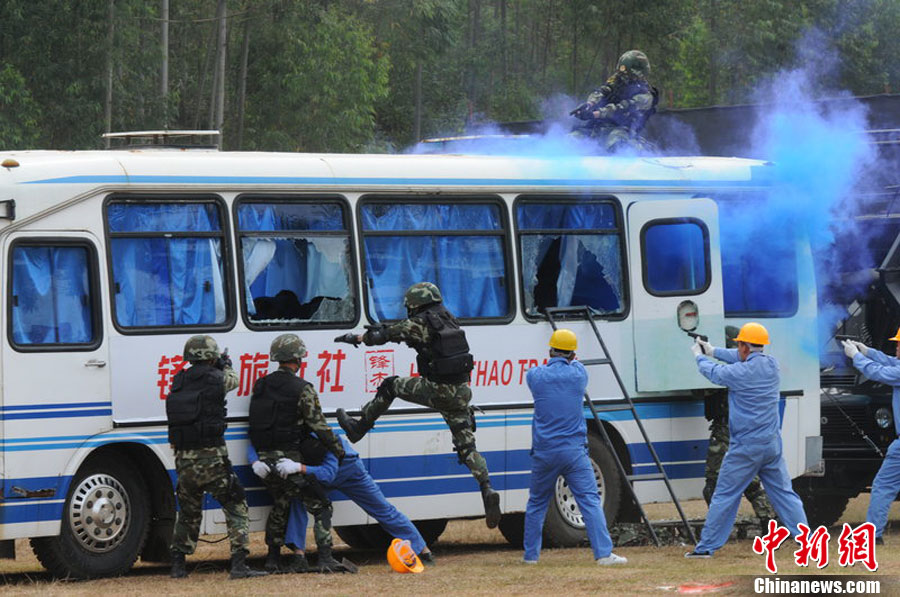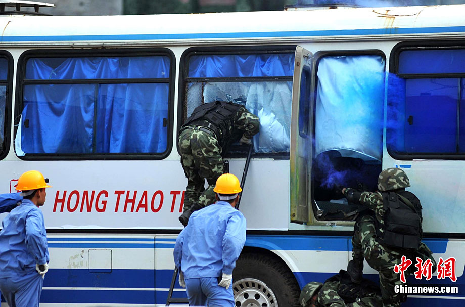 10月28日,廣西舉行亞運安保反恐演練。在演習(xí)中,警方采用了多種先進(jìn)反劫持設(shè)備,模擬各種突發(fā)狀況。圖為演練被劫持大巴人質(zhì)解救過程。廣西共有八條通道通往廣東,是環(huán)粵亞運安保的重點地區(qū)之一。中新社記者 蔣雪林 攝