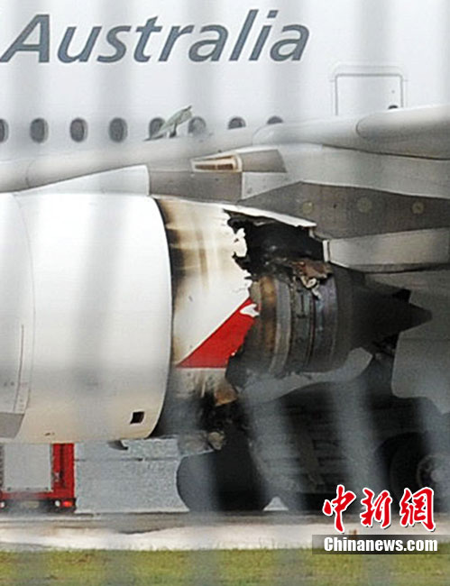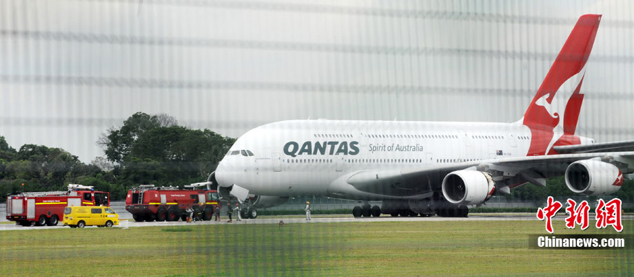 11月4日,澳大利亞航空公司否認(rèn)該公司一架飛機(jī)墜毀的消息,稱該架飛機(jī)是引擎出現(xiàn)故障,已經(jīng)在新加坡機(jī)場緊急降落。據(jù)悉,澳大利亞航空公司一架航班號為QF32的空客A380客機(jī)引擎出現(xiàn)故障,被迫關(guān)閉了4個引擎中的1個,于當(dāng)?shù)貢r間4日中午12時左右在新加坡機(jī)場實施降落。圖為發(fā)生故障的澳航客機(jī)停在新加坡機(jī)場。